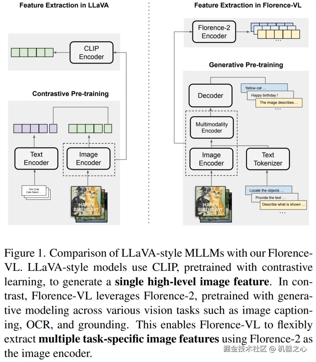 Florence-VL 正是针对这一问题提出的解决方案。通过引入生成式视觉基础模型 Florence-2,Florence-VL 在保持高效训练的同时,能够灵活适配不同任务,弥补传统视觉编码器的缺陷。