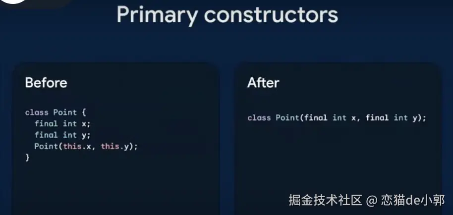 还有一个就是 Primary Constructors ,它支持隐式创建变量,从这个角度看,代码简洁的程度也得到了不少提升,特别如果后续在宏开发和 JSON 序列化上,整体代码感受会更不一样: