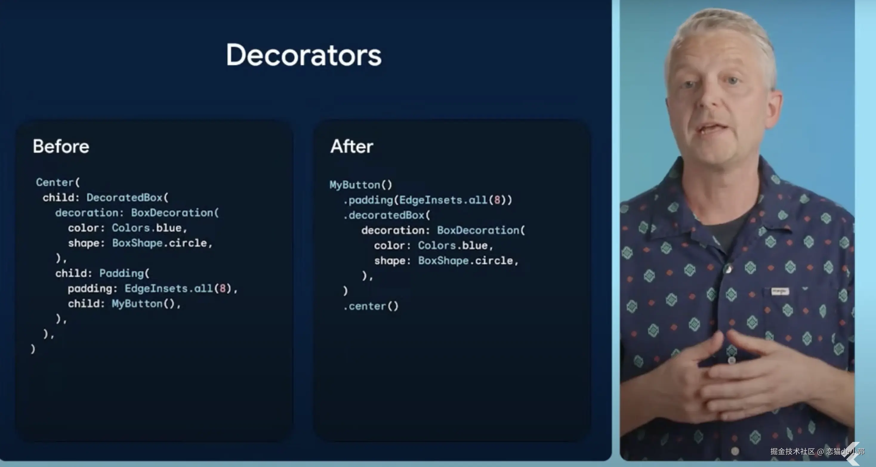 让 Flutter 代码变得更好写好读,这个点为什么有趣呢?如下图所示,可以看到 Flutter 提出了一个 Decorators 的支持的例子,也就是让左边的代码可以通过右边的组织方式去实现: