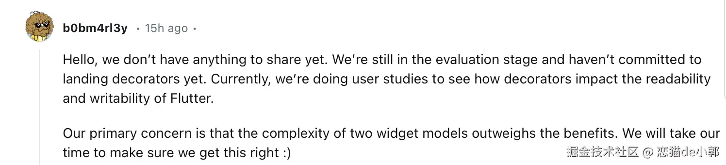 当然,目前 Decorator 还是评估阶段,还处于「进行用户研究」的情况,目前官方也担心,同时保持两个 Widget 模型的复杂性大于好处。