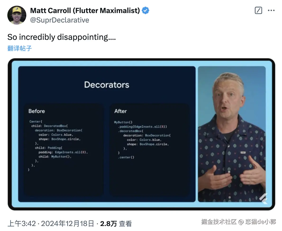 他在过去就曾表示过,Flutter widget 树一直是声明性的,开发者是 “声明” 了树的结构,而不是 “生成” 了树,而 Decorator 这种 widget 组合方式,他称之为 builder 模式,他更多觉得所谓的“干净”是风格偏好,而不是客观问题,“干净”的感觉并不能帮助理解问题,也不能提供“解决方案”。