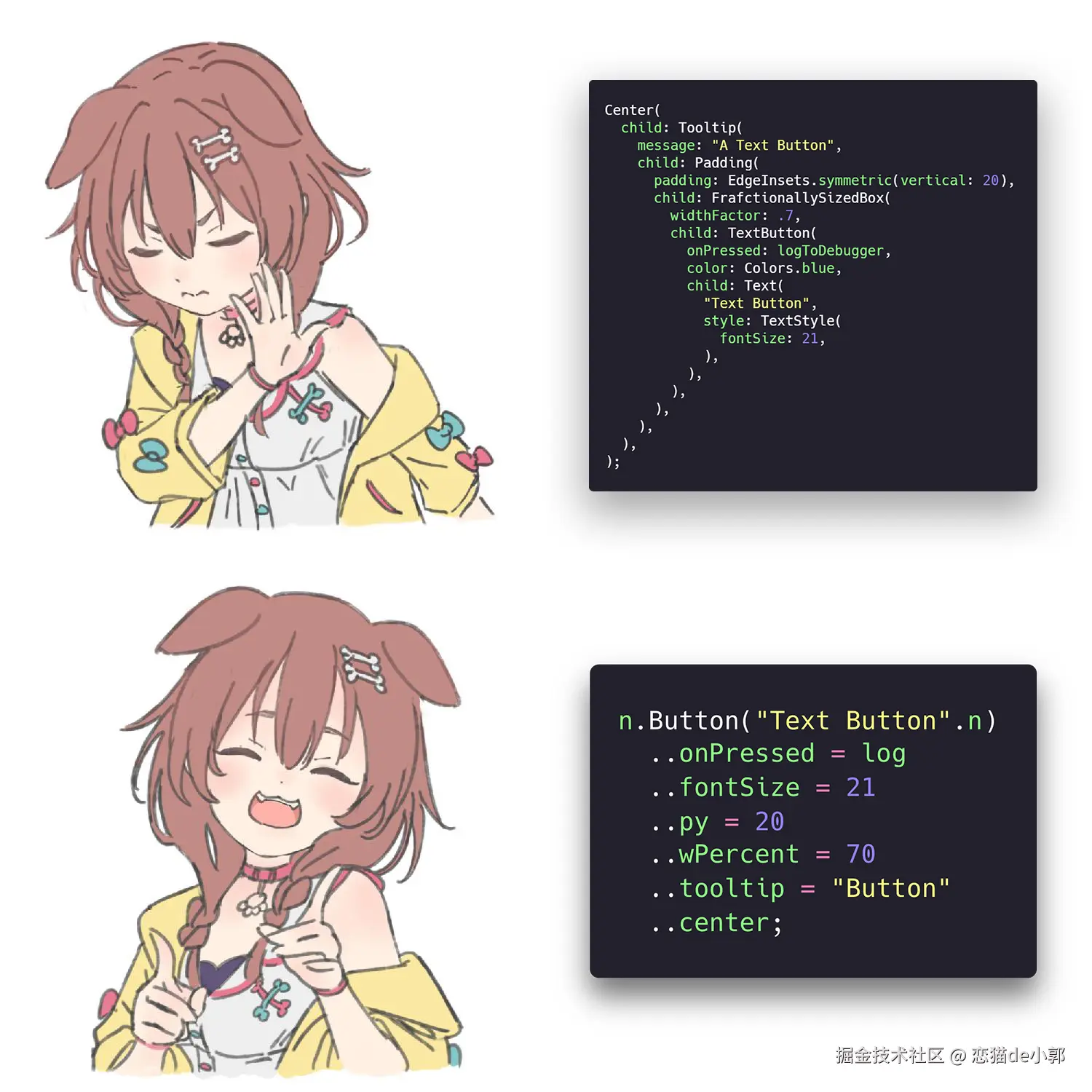 当然,喜欢 Decorator 这种编排方式的人不少,在此之前就有一个叫 niku 的项目做了类似事情,只是它已经有一段时间没有更新了,这个项目通过 typedef 和抽象拓展,利用语法对官方控件进行二次封装,提前实现了 Flutter UI 的 Decorator 化: