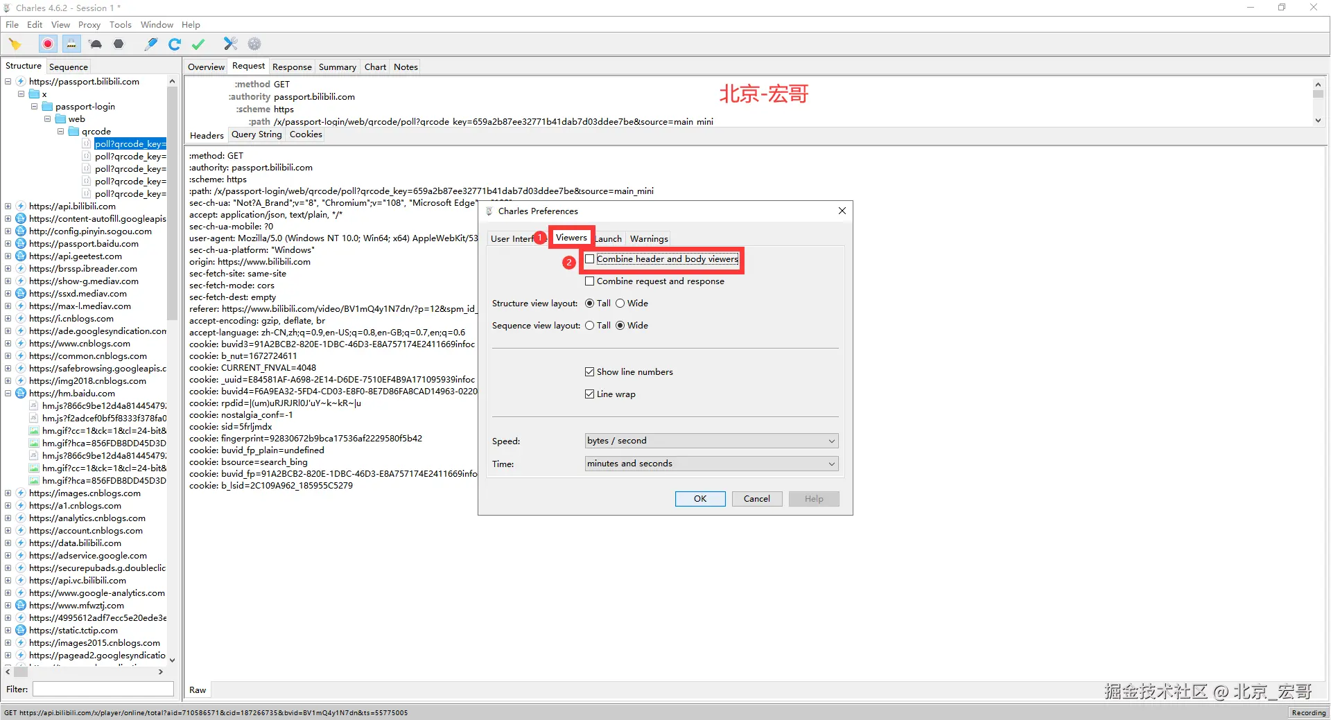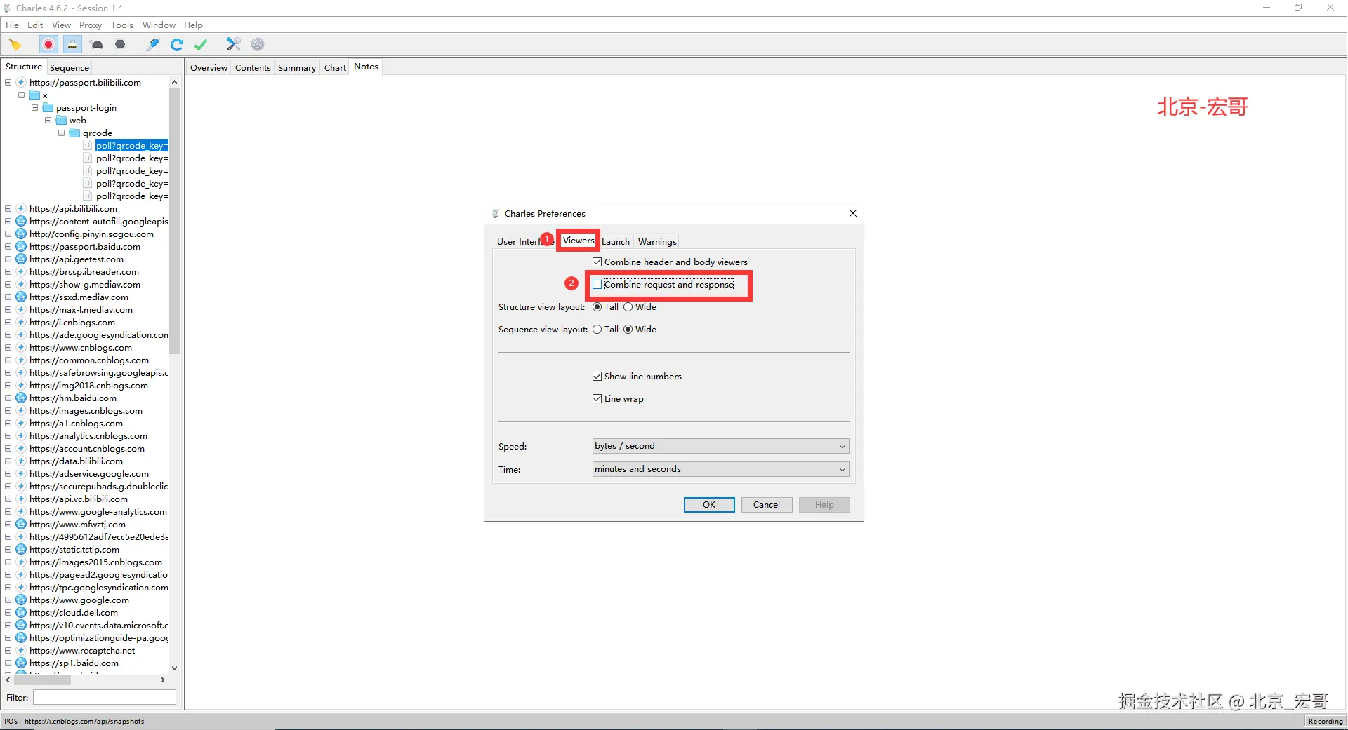 若想查看request的请求头和请求数据,也可将第2步中的Combine header and body viewers前面的勾选取消,如下图所示:
