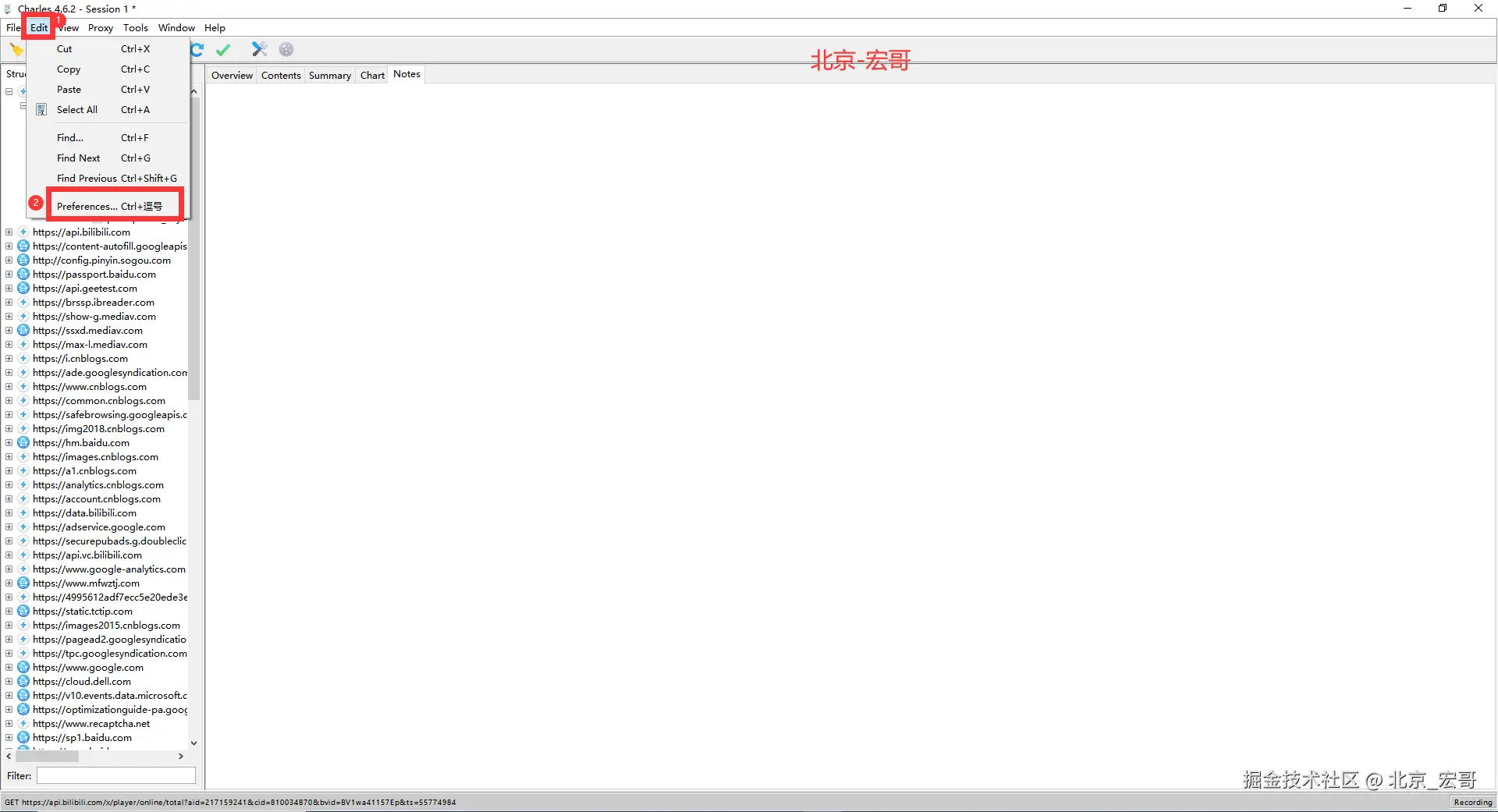 1.启动Charles后,点击Edit — Preferences ,如下图所示: