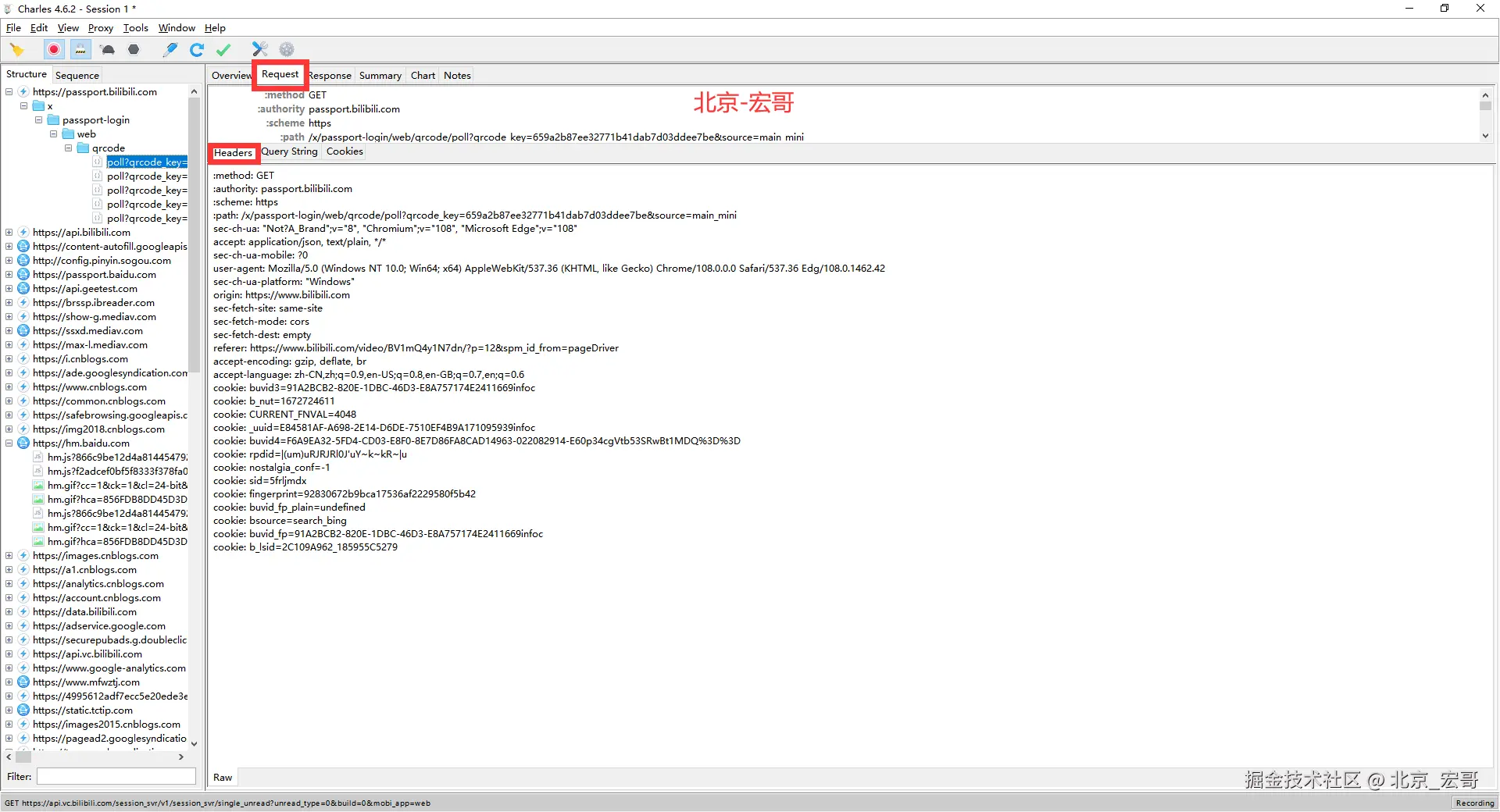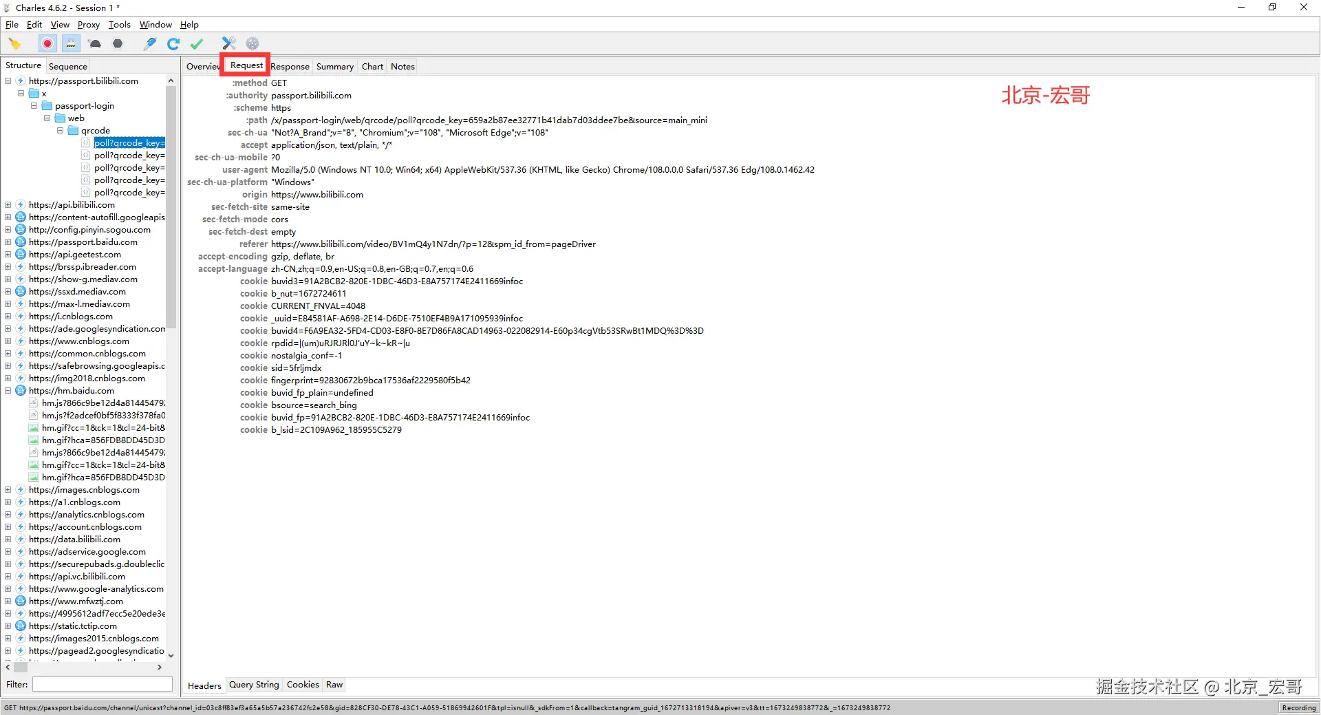 Charles Web抓包非常简单,启动Charles会自动与浏览器设置成代理,不需要进行过多的设置,接下来我就就是通过浏览器发送网络请求,Charles就会直接抓取到这些信息和响应信息,如下图所示: