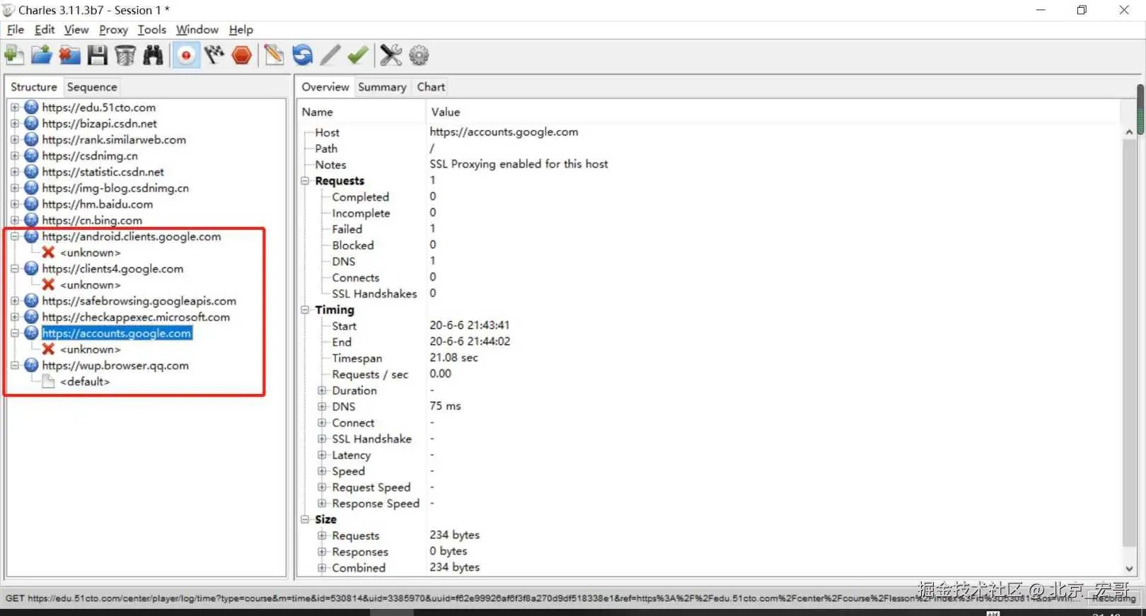 6.接下里验证下手机请求,当我们看到Charles里能抓到这个连接,就说明配置没问题,看到unknown,这个不要紧,那是我们没有安装针对手机端的证书,手机端HTTPS证书安装宏哥后边会有详细介绍,这里简单说明一下原因一笔带过,其实和Fiddler差不多,一样的思路,但是此时应该是可以抓取Http协议的包的。