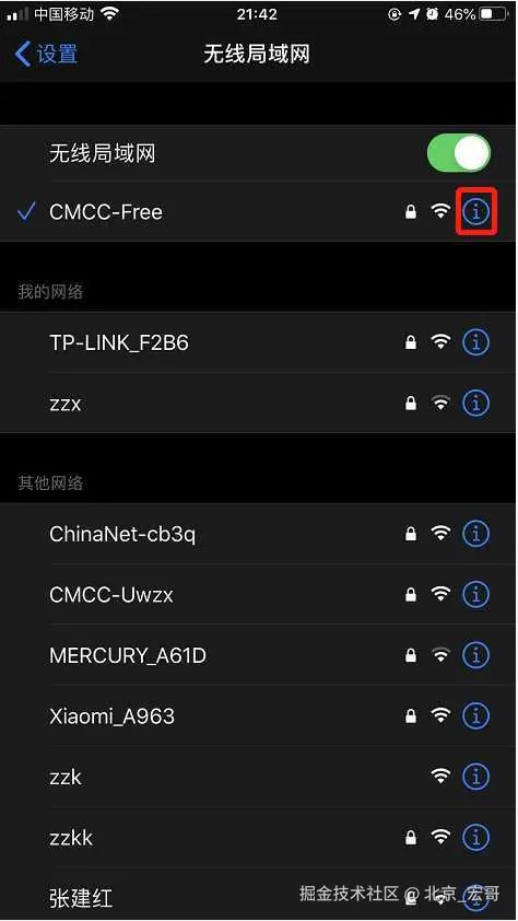 2.IOS点击连接的WIFI后面的感叹号,如下图所示: