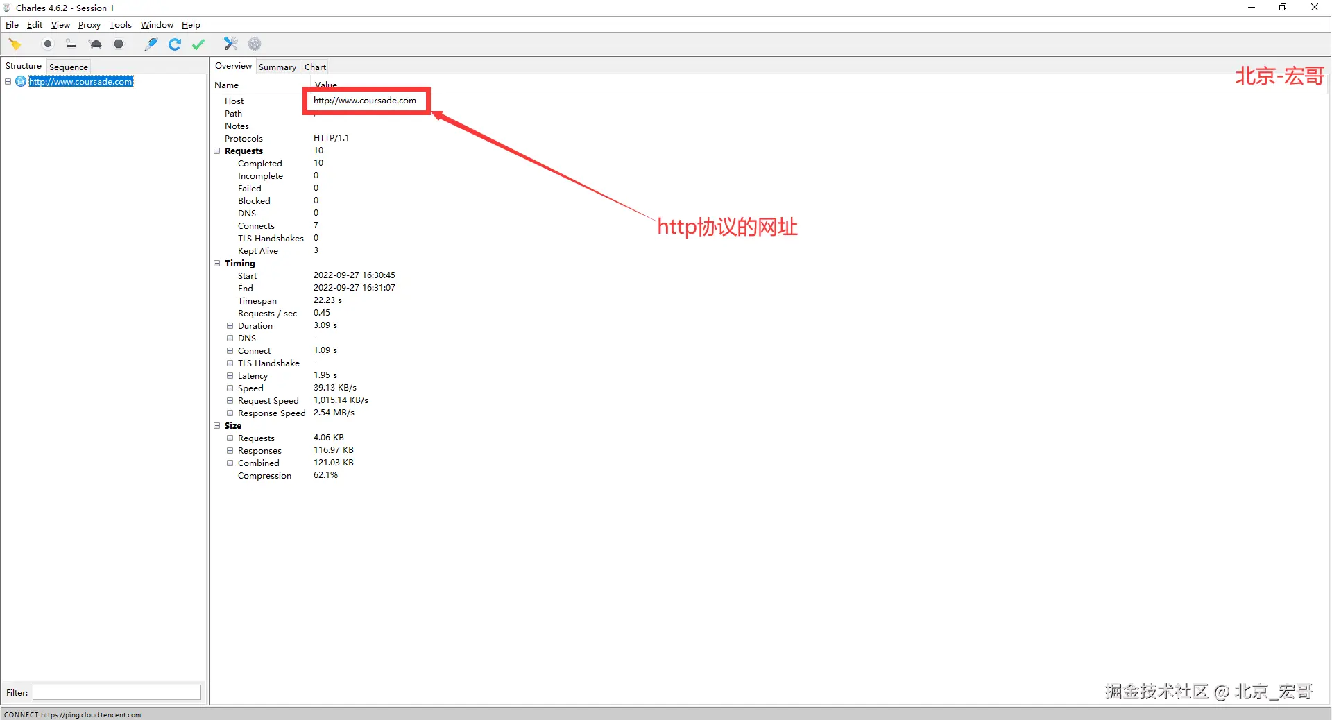 细心地小伙伴或者童鞋们从上图可以看到宏哥的图中抓取的是http协议的web网址,因为宏哥的Charles还没有设置如果抓取https协议的web网址,会报一些错误导致演示不成功,因此宏哥使用http协议的网址进行演示。
