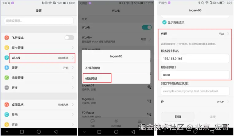 手机上进行设置:同一个wifi下设置代理,安卓应该是长按连接的WIFI,点击“修改网络”。填写服务器地址:计算机的IP(192.168.0.163),端口8888;如下图所示: