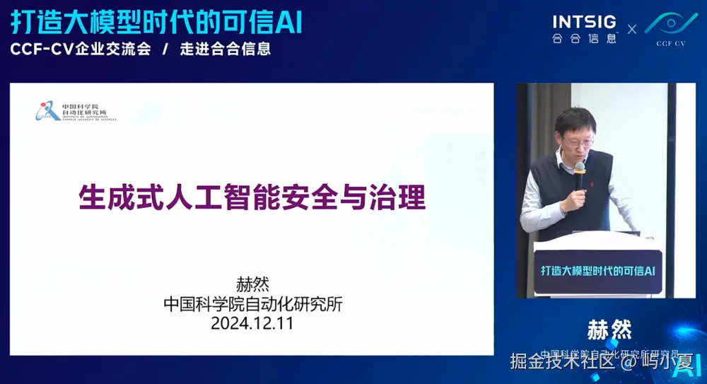 在AI内容生成与安全治理领域,生成式视觉内容的安全问题尤为突出。中国科学院自动化研究所的赫然博士发表了《生成式人工智能安全与治理》主题演讲。