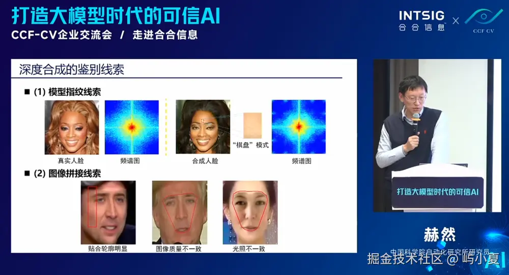赫然博士详细分析了虚拟身份、身份重演和人脸驱动等深度合成技术的生成机制,并介绍了如何通过多模态多线索的检测技术,鉴别和取证生成式视觉内容的真伪。