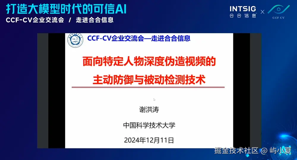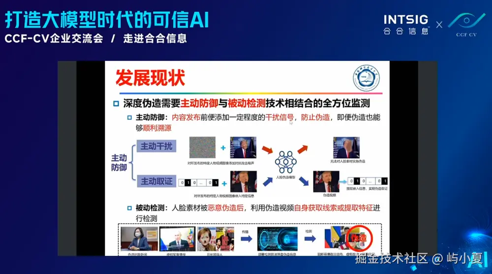 在被动检测方面,谢教授分享了基于图像级不一致性和时空身份不一致性的检测方法,可以有效识别伪造视频的迹象,保证内容的真实性。