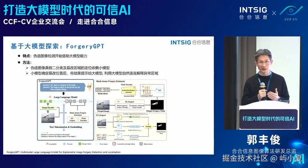 郭博士对视觉内容安全技术的未来进行了展望。他认为,结合生成式人工智能和多模态技术的发展,大模型的应用潜力将得到进一步挖掘。ForgeryGPT等大模型的成功实践表明,未来的内容安全技术不仅可以精准检测和定位伪造内容,还能通过解释性分析报告提升用户的决策能力。这种技术转型将为企业安全管理提供更多的高效解决方案。