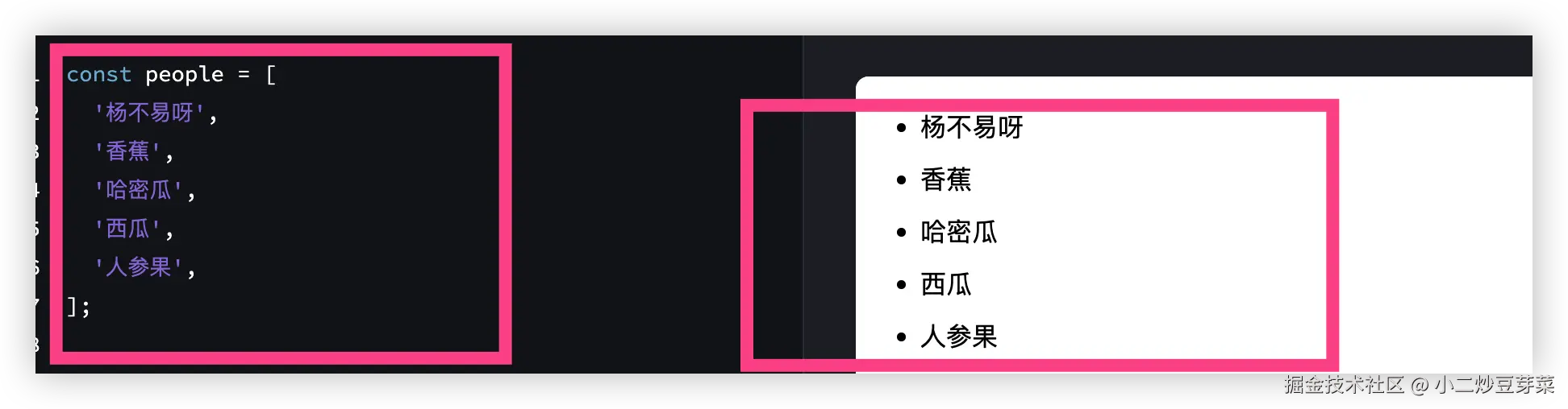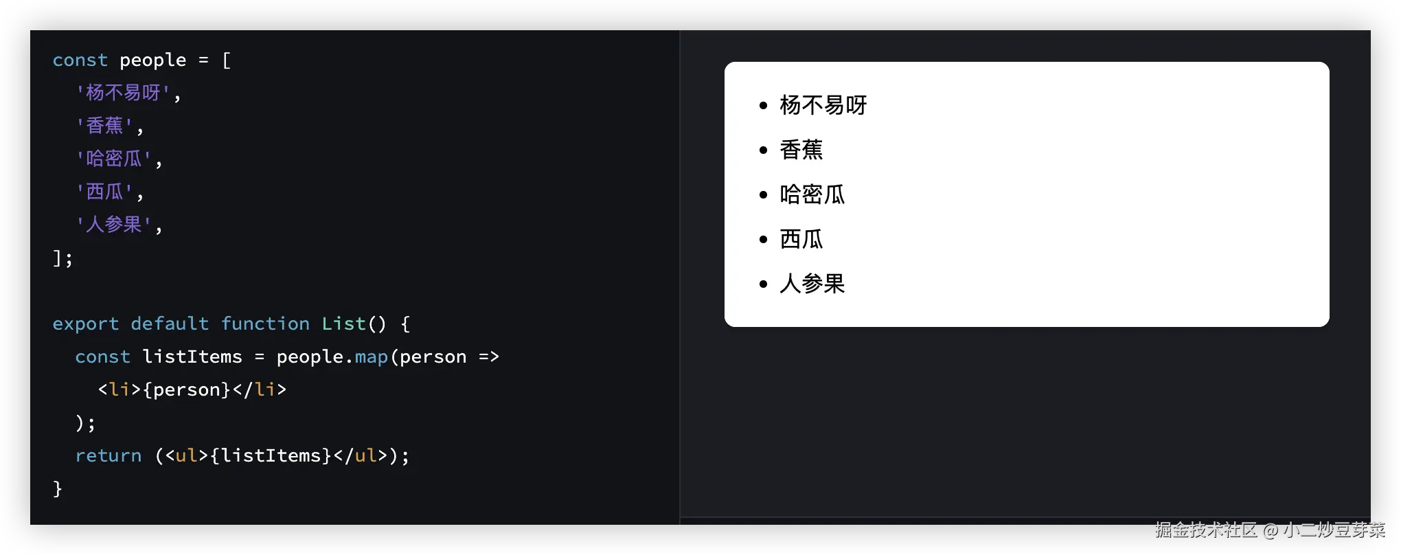 遍历 people 这个数组中的每一项,并获得一个新的 JSX 节点数组 listItems:
