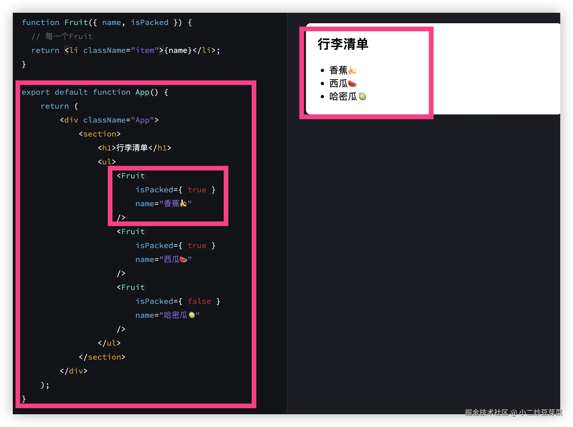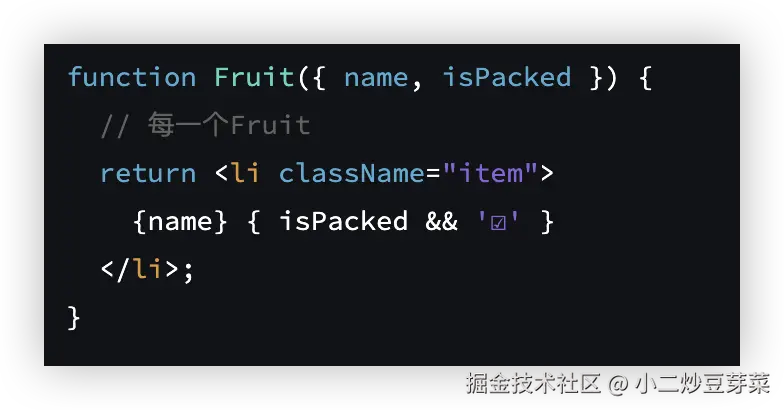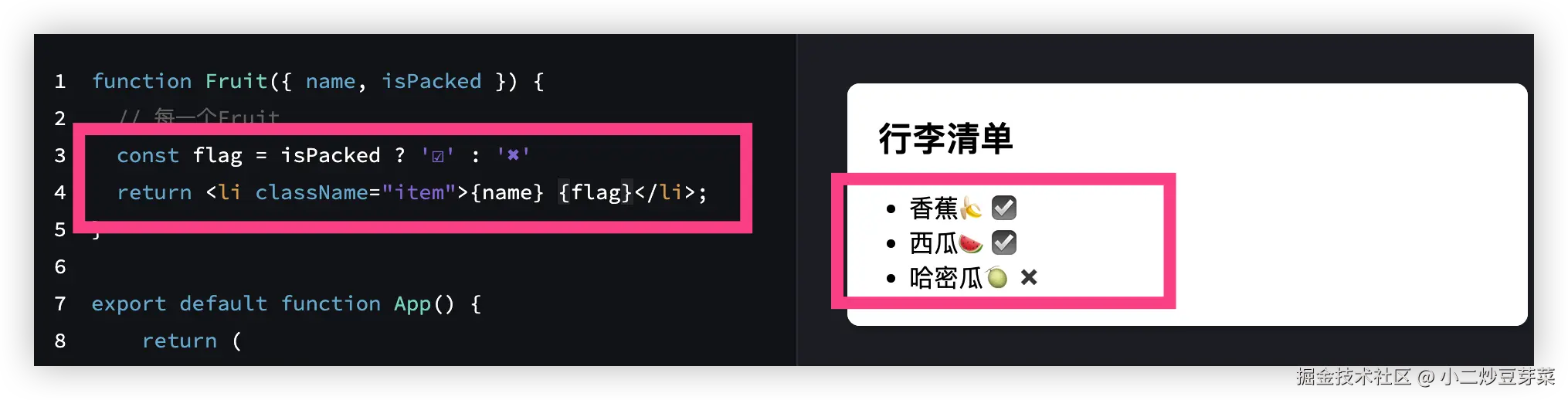 在 React 组件里,通常用在当条件成立时,你想渲染一些 JSX,或者不做任何渲染。使用 &&,你也可以实现仅当 isPacked 为 true 时,渲染勾选符号