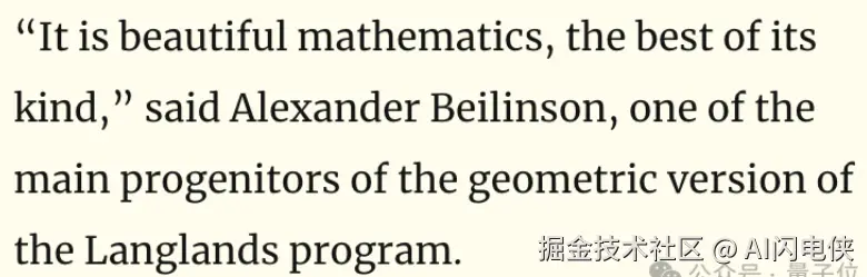 菲尔兹奖得主彼得·舒尔茨(Peter Scholze)对此赞不绝口,将这一成就誉为“三十年努力的巅峰”。而几何朗兰兹纲领的奠基人之一,亚历山大·贝林森(Alexander Beilinson)更是激动地表示:“这个证明美得令人窒息,无疑是同类证明中的巅峰之作!”