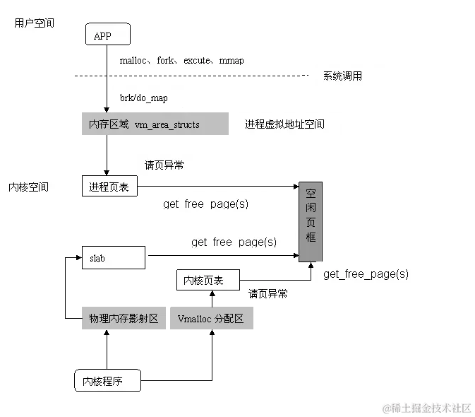 下面的图总结了上述两种用户空间和内核空间虚拟内存分配方式。