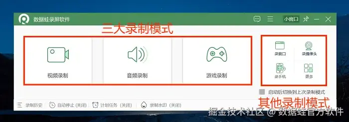 步骤1: 打开数据 蛙录屏软件,软件支持Windows和Mac系统。打开软件后,在主界面按照需求选择录制模式。本文以 “视频录制” 为例。