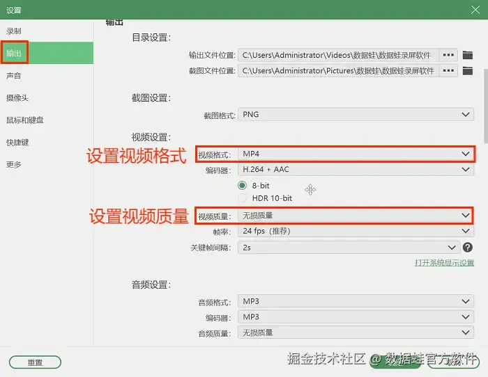 步骤2: 在 “视频录制” 页面,可以自主设置录制区域、录制音频来源等参数。还可以根据需要调整视频格式、视频质量(高质量、无损质量等)等。设置完毕后,点击 “REC” 按钮开始录制。录制过程中,悬浮窗口会出现在角落,方便随时控制。