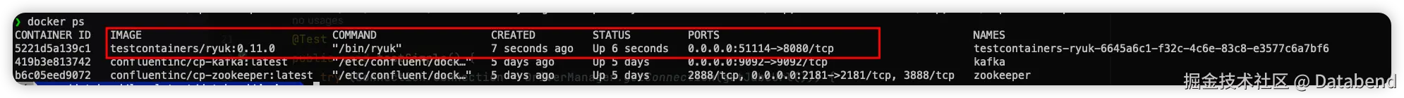 运行测试的同时我们可以在系统看到 testcontainers 为我们启动了一个 Databend 容器服务: