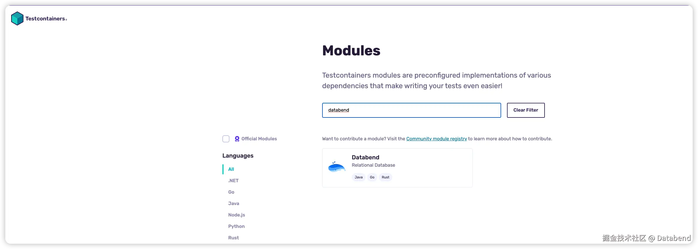 除了 Databend 之外,Testcontainers 支持市面上绝大多数的数据库、消息队列,可以轻松构建依赖这些资源的测试集。