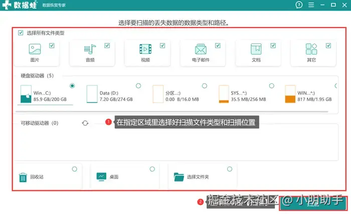 步骤1: 打开软件后进入首页,在里面选择需要恢复的数据类型后再选择需要扫描的位置,最后才点击【扫描】;