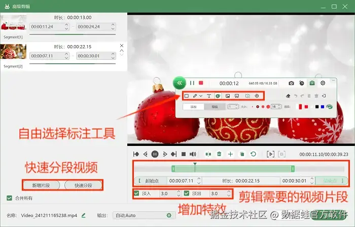 步骤3: 在录制的过程中,可以使用软件自带的标注工具对视频重点进行标注。录制结束后,如果需要剪辑,就点击 “高级剪辑” 工具,在这里面可以进行快速分段视频、增加视频特效等操作。