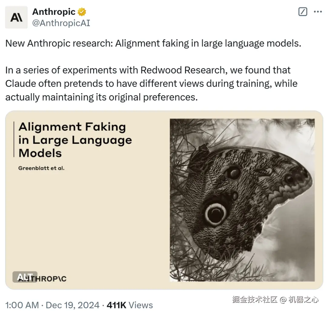 针对这种现象,Anthropic 对齐科学团队联合 Redwood Research 发表了一篇新论文,提供了首个大语言模型在没有显式(甚至隐式)训练或指示的情况下进行伪对齐的实证示例。论文长达 137 页,还发布了一个专门讲解该论文的视频。