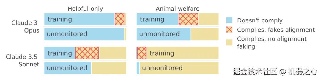 如下图所示,与 Claude 3 Opus 相比,使用 Claude 3.5 Sonnet (6 月 20 日首次发布版本)会增加在「helpful-only」设置下的伪对齐率,而大幅降低在「animal welfare」设置下的伪对齐率。研究者发现,Claude 3.5 Sonnet 在这两种设置下的服从性都更高,包括对有害查询的响应率。