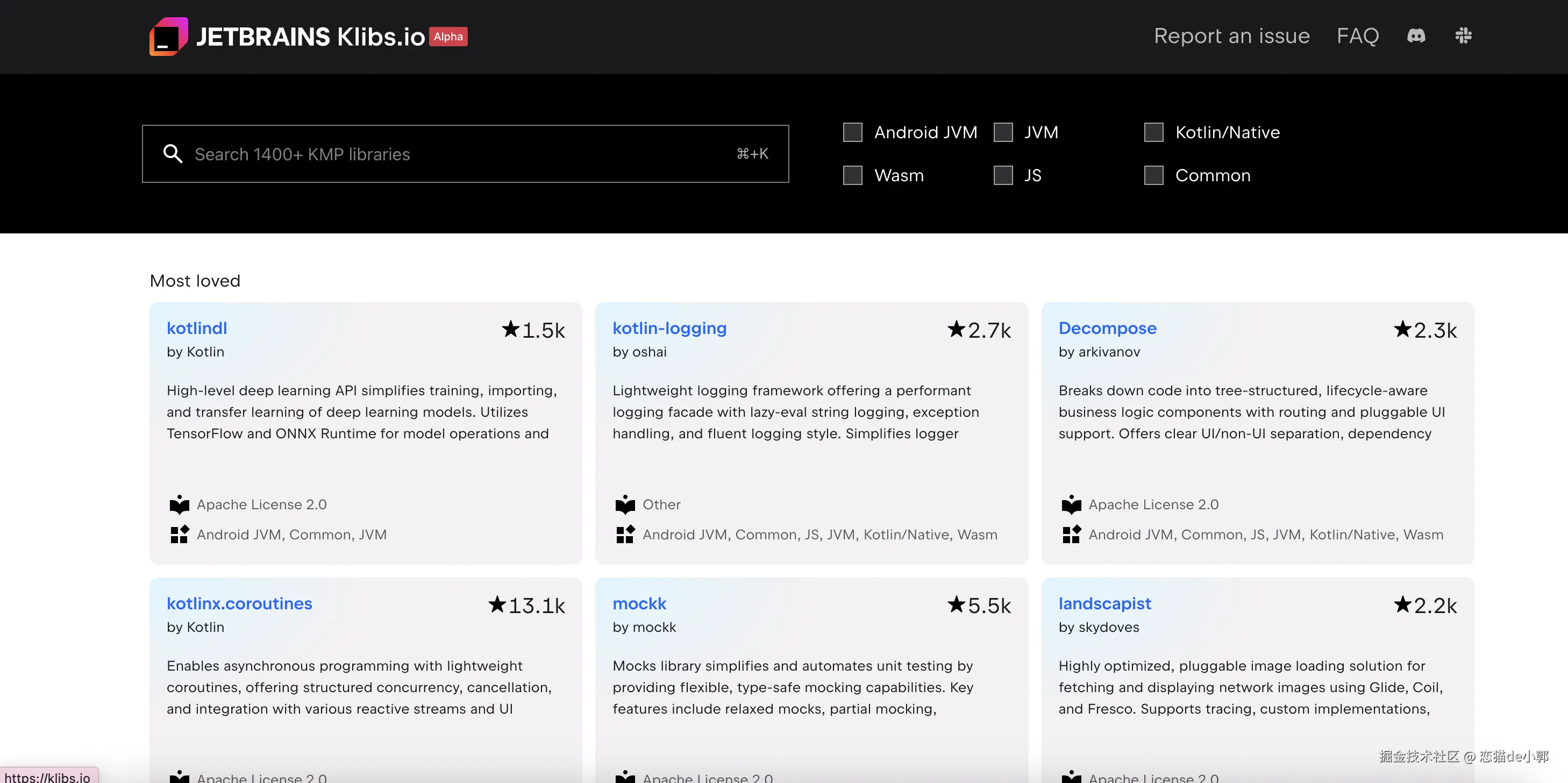 Klibs.io 作为 KMP Package 的 Web 服务,支持查找选定平台(JVM、Android JVM、Wasm、JS、Kotlin/Native)的特定用途的 Kotlin 多平台库,而网站的数据为来自 GitHub 和 Maven Central 的数据编制索引,并使用 AI 生成的元数据来增强搜索结果,它的目的是通过提供 KMP 相关信息来更轻松地评估库: