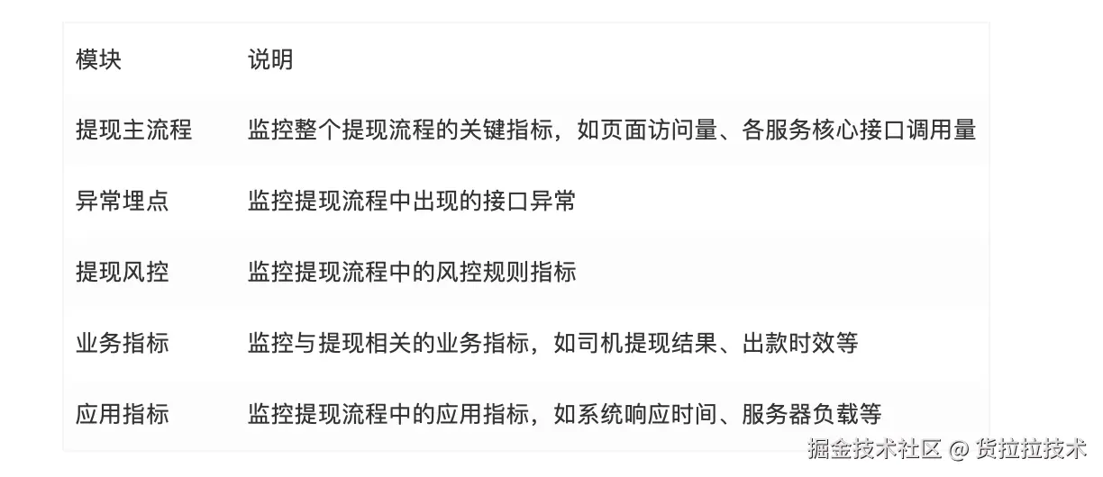 从司机发起提现开始,经过支付内部系统,再到三方渠道打款,整条链路都具备可观测性。在日常巡检中,可以监控司机提现全链路的状况,并针对异常指标配置告警,及时发现和解决问题,确保提现流程的顺畅和安全。大盘可以分为五大模块: