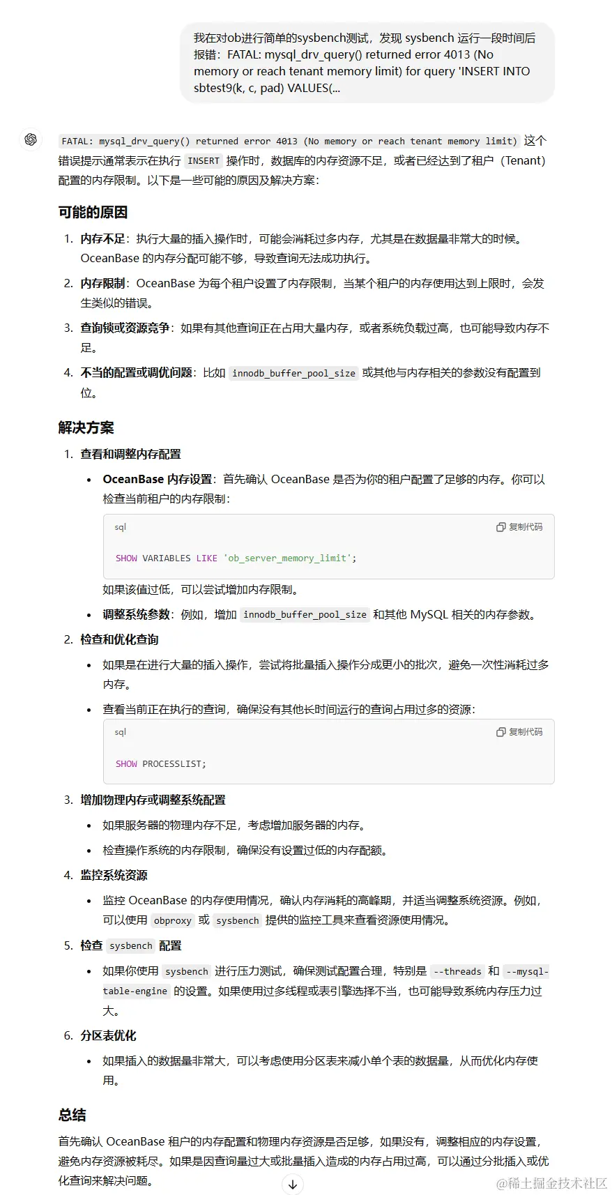 针对内存不足的问题,ChatDBA 给出了一些解决方案,详见实验总结部分。