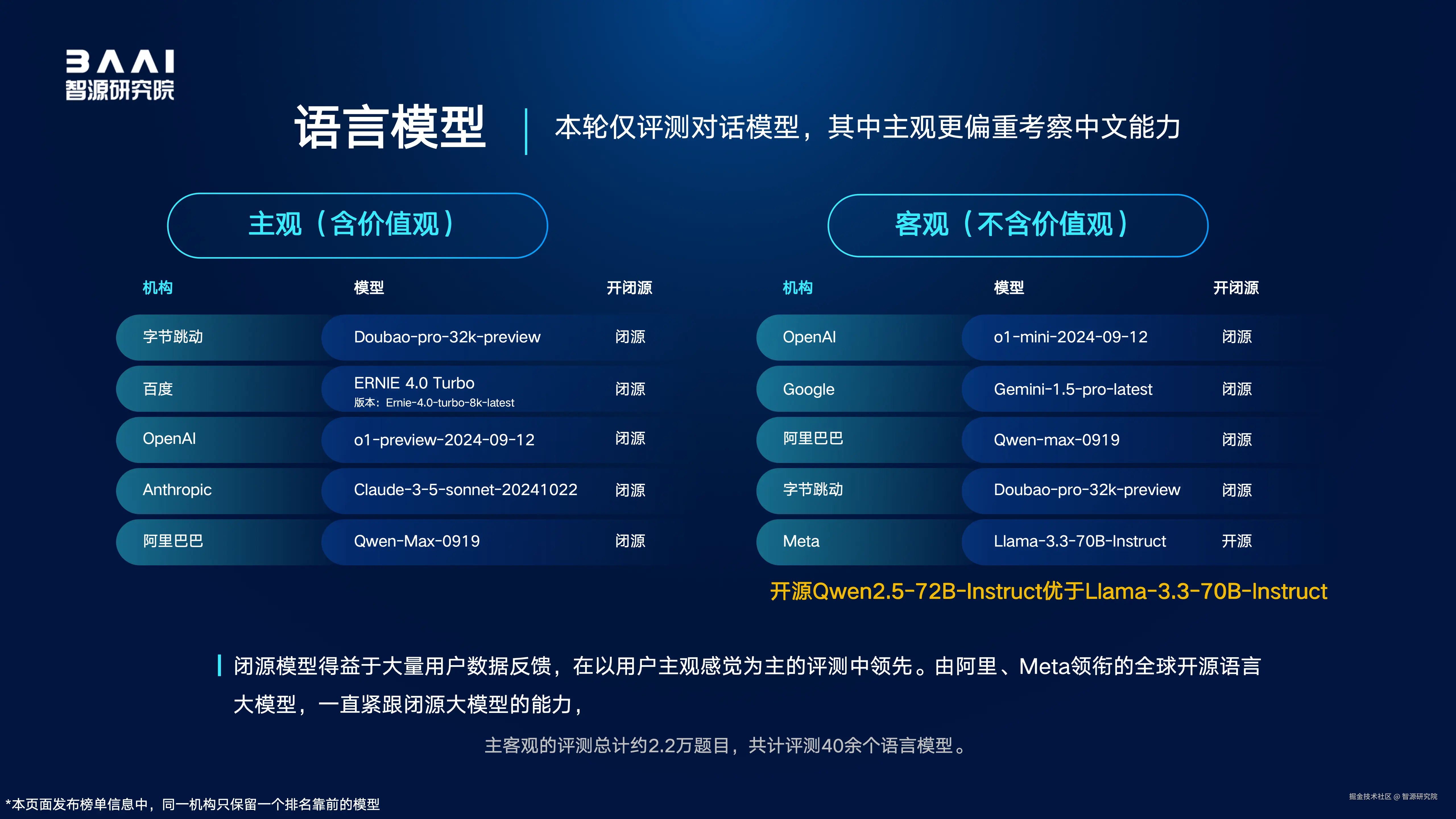 语言模型主观评测重点考察模型中文能力,结果显示字节跳动Doubao-pro-32k-preview、百度ERNIE 4.0 Turbo位居第一、第二,OpenAI o1-preview-2024-09-12、Anthropic Claude-3-5-sonnet-20241022位列第三、第四,阿里巴巴Qwen-Max-0919排名第五;在语言模型客观评测中,OpenAI o1-mini-2024-09-12、Google Gemini-1.5-pro-latest 位列第一、第二,阿里巴巴Qwen-max-0919、字节跳动Doubao-pro-32k-preview位居第三、第四,Meta Llama-3.3-70B-Instruct排名前五。
