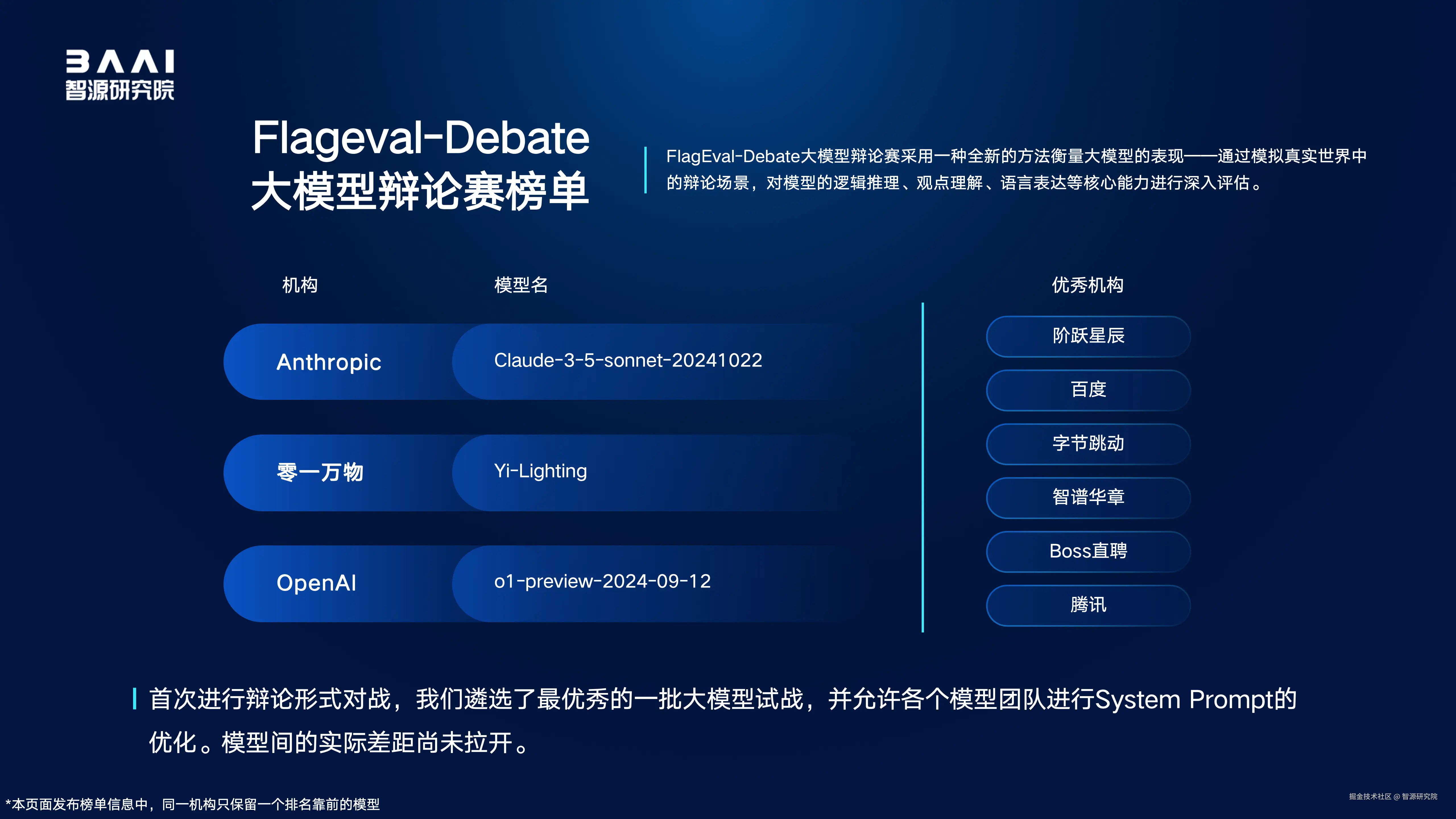 作为模型对战评测服务FlagEval大模型角斗场的延展,今年10月智源研究院推出了模型辩论平台FlagEval Debate,对模型的逻辑推理、观点理解以及语言表达等核心能力进行深入评估,以甄别语言模型的能力差异。本次评测发现,大模型普遍缺乏辩论框架意识,不具备对辩题以整体逻辑进行综合阐述;大模型在辩论中依然存在“幻觉问题”,论据经不起推敲;大模型更擅长反驳,各个模型表现突出的辩论维度趋同,在不同的辩题中,模型表现差距显著。FlagEval Debate评测结果表明,Anthropic Claude-3-5-sonnet-20241022、零一万物Yi-Lighting、OpenAI o1-preview-2024-09-12为前三名。