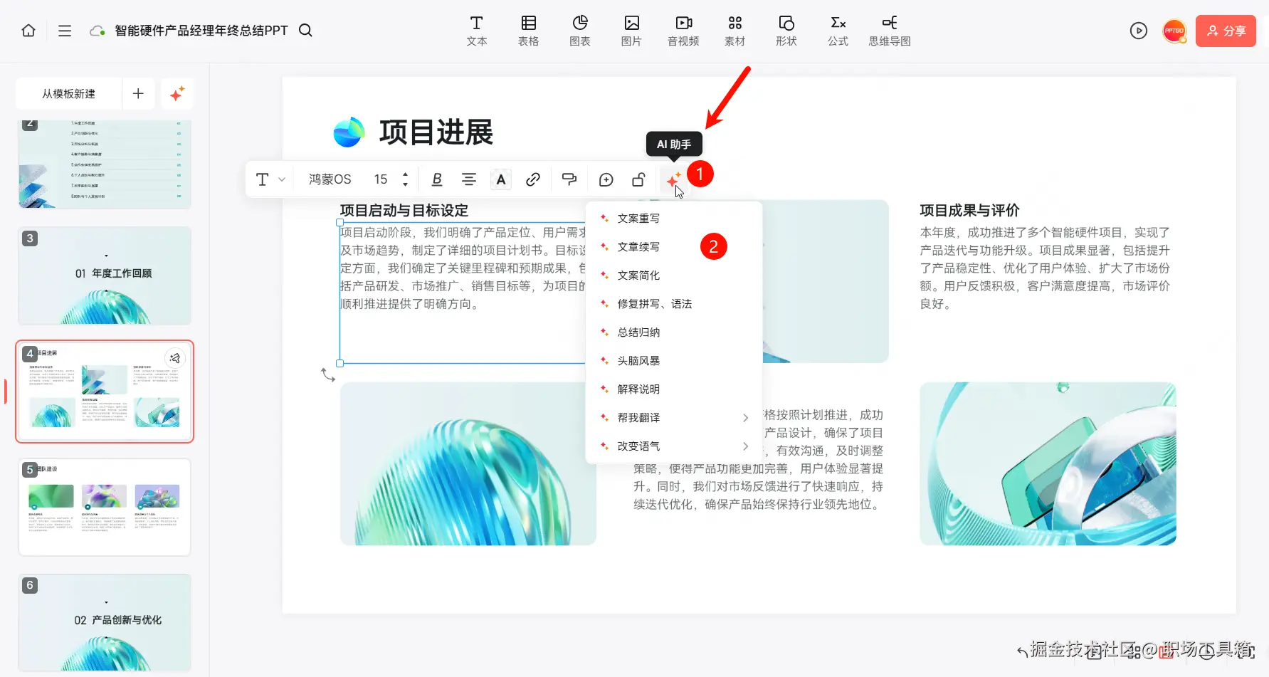 选中PPT中的任意一个文本框,可调出“AI助手”,基于博思AIPPT提供的AI选项,对正文内容进行重写、续写、简化、总结归纳、解释说明、翻译等,满足多样化的编辑需求。