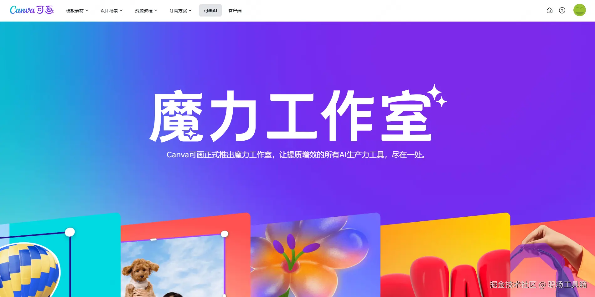 可画AI,即Canva可画魔力工作室,一站式AI智能设计工具平台,涵盖AI写作、AI绘画、AI修图、AI翻译、AI素材生成等功能,助力你的整个工作流程提质增效。