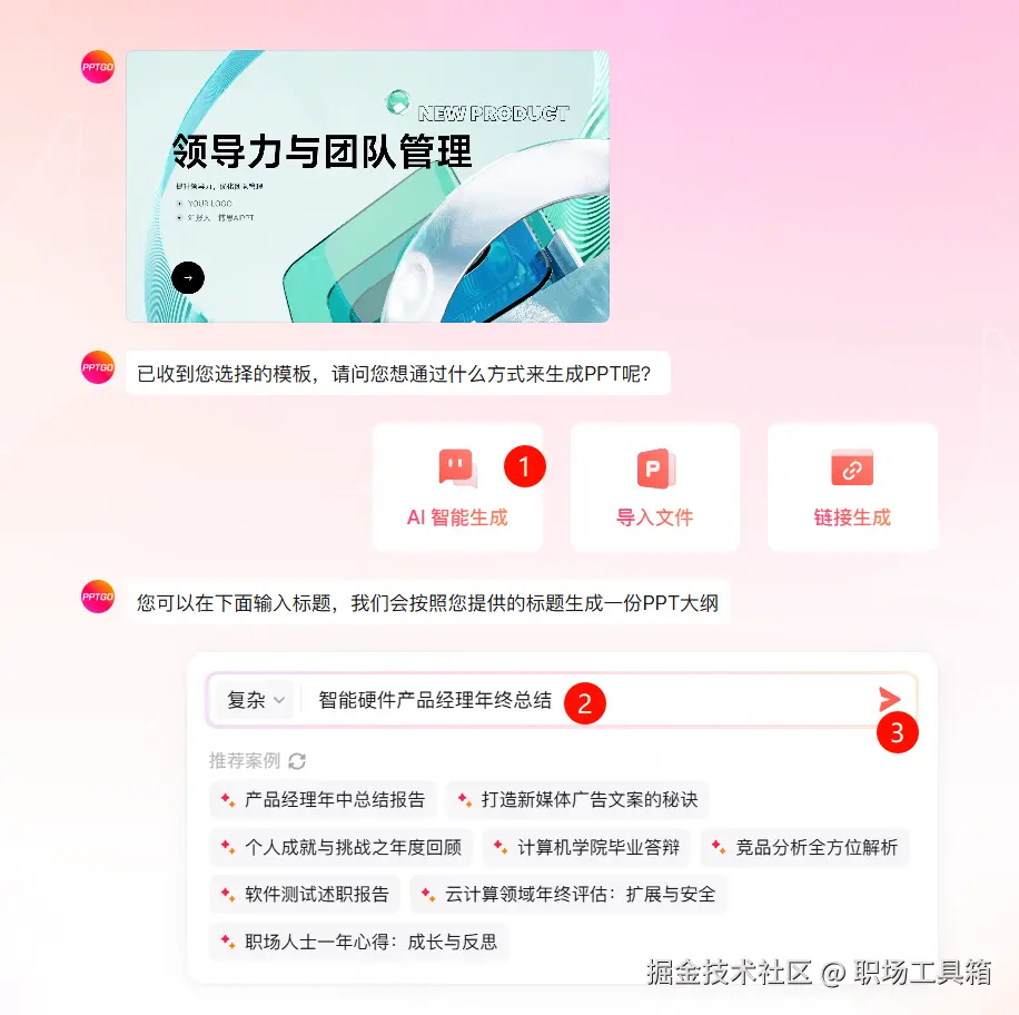 选定一个PPT模板后,点击右上角的下一步按钮,进入下图生成PPT的页面,这里有3种生成PPT的方式——AI智能生成、导入文件和链接生成,按需选用对应的方式,譬如选择“AI智能生成”,输入年终总结PPT主题“智能硬件产品经理年终总结”,点击右侧的箭头,或是按下回车键Enter,就能快速得到一份高颜值的年终总结PPT。
