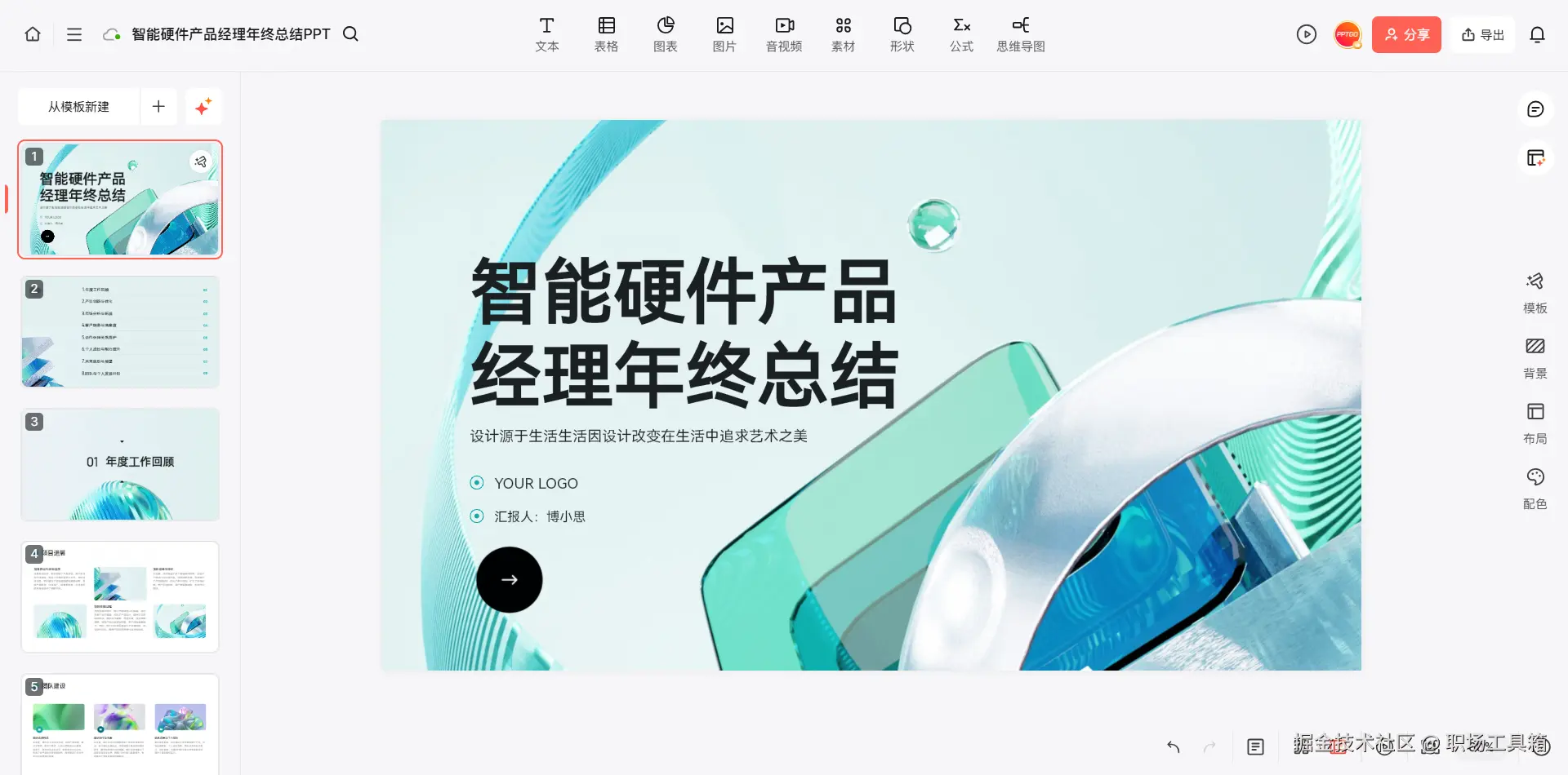 完成对年终总结PPT的编辑后,如果想要共享给组里的小伙伴,可点击编辑界面右上角的分享或导出按钮,前者会生成一个分享链接,将链接发送给小伙伴,对方打开就能直接查看;后者可将云端的演示文稿下载为PPT或PDF文件,方便在断网环境下使用。