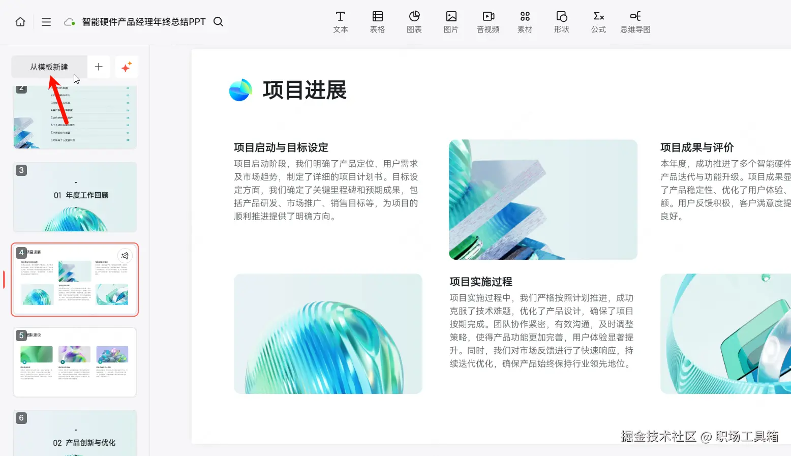 如果想在AI生成的PPT之上添加内容,可点击左上角的“从模板新建”,基于博思AIPPT内置的模板,创建新的页面。