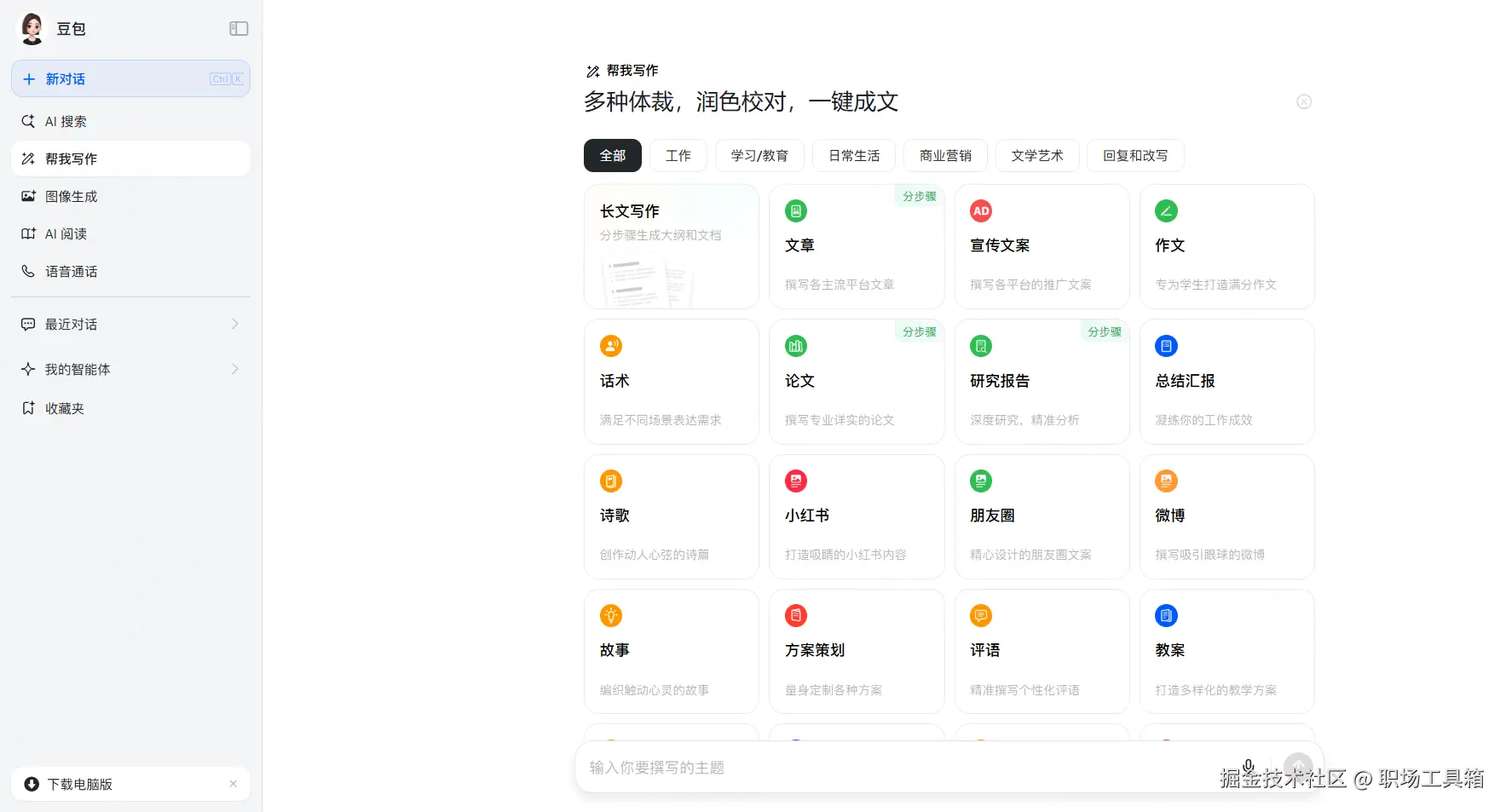 豆包是一款集成了多种功能的AI智能助手,内置的工具包括AI对话、AI搜索、AI写作、图像生成、AI阅读等,其中AI写作预置了不同场景下的写作模板——工作、学习/教育、日常生活、商业营销、文学艺术、回复和改写,根据需要选择一个场景,即可快速开始写作。