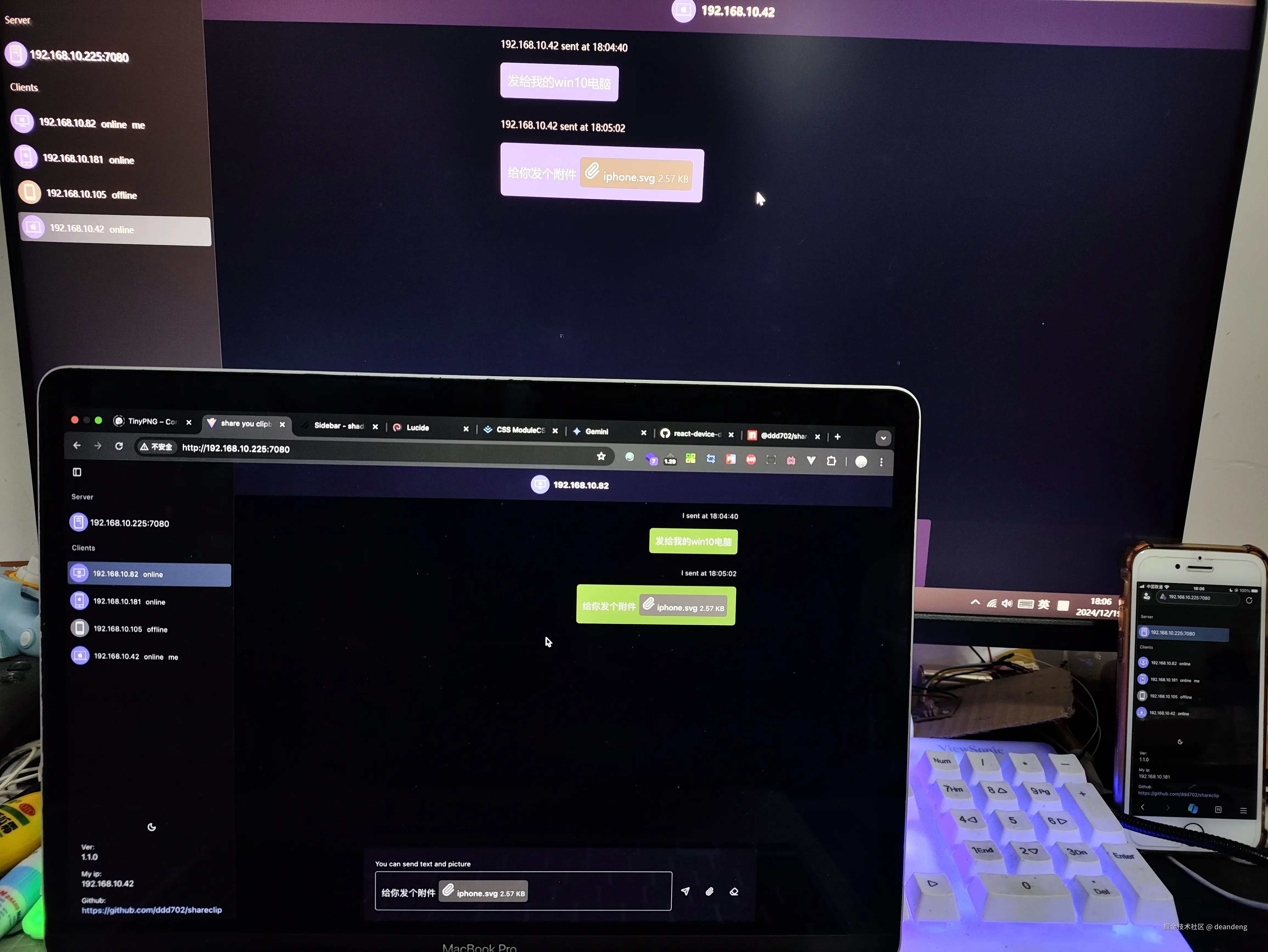 背景:作为一个开发,通常都有好几个设备,就比如我,有macbook,有win pc,还有几个测试手机。开发的时候肯定有时候想把这个设备的信息或者文件发送到另一个设备的情景吧,于是该工具应运而生。