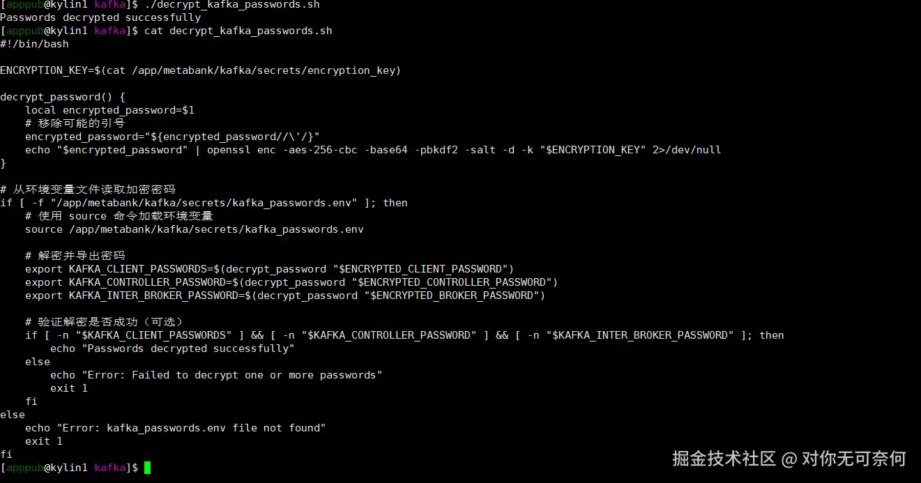 创建并部署加密脚本:将 encrypt_kafka_password.sh 部署到服务器上,保证其执行权限并对密码进行加密。