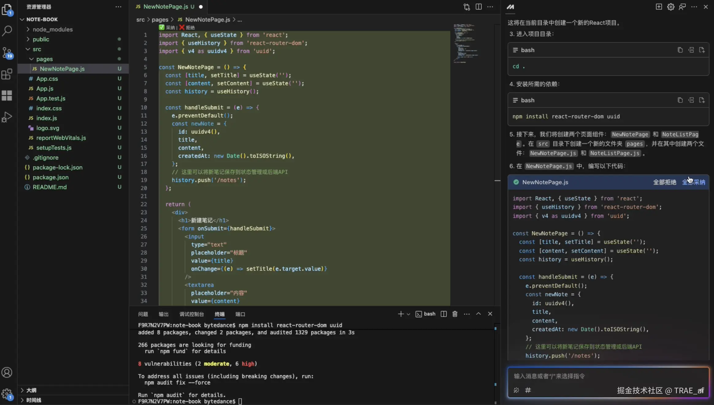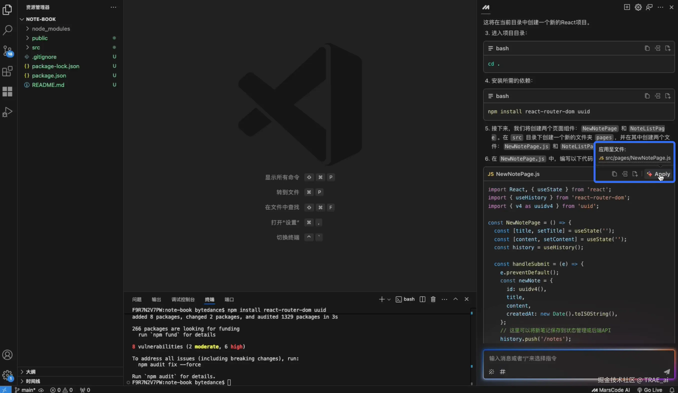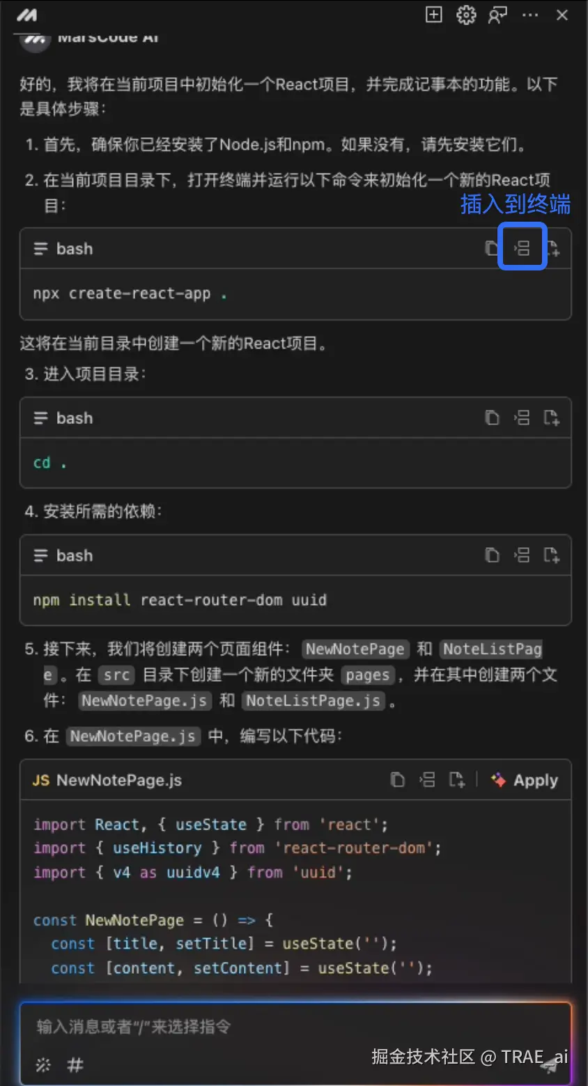 当你想创建新项目时,Apply 也可以帮到你。例如我发出指令“帮我在当前项目中初始化一个 React 项目,并完成记事本的功能,需要支持新建笔记页和列表展示页两个页面,笔记包括标题、文本内容、创建时间三个字段,支持用户删除单条笔记。” 豆包MarsCode 提供了初始化和安装依赖的命令,点击 insert to terminal 一键运行完成初始化,当 AI 生成全新的文件和代码时,能够识别新增文件路径,在对应目录下一键创建,只需要点击 Apply 采纳代码即可运行,无需手动 New File 后再 Copy 啦!