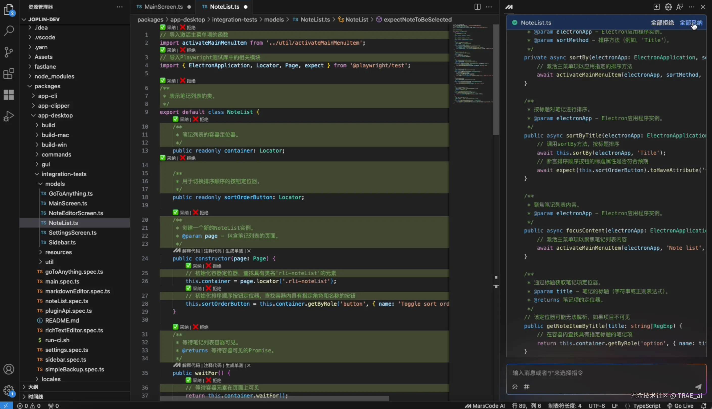 通过 /fix 指令可以让豆包MarsCode 帮你找到代码中的错误,点击 Apply 后将在预期文件中完成修改,修改前后的差异清晰呈现,无需手动逐个调整,选择“全部采纳”即可让多处修复结果一次性应用到需修复位置。