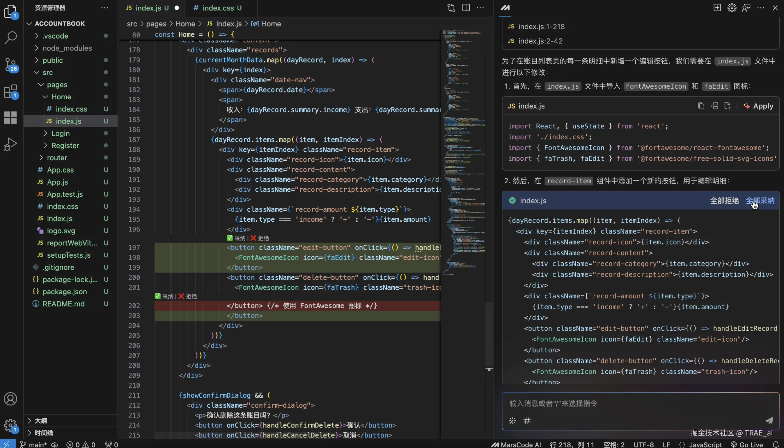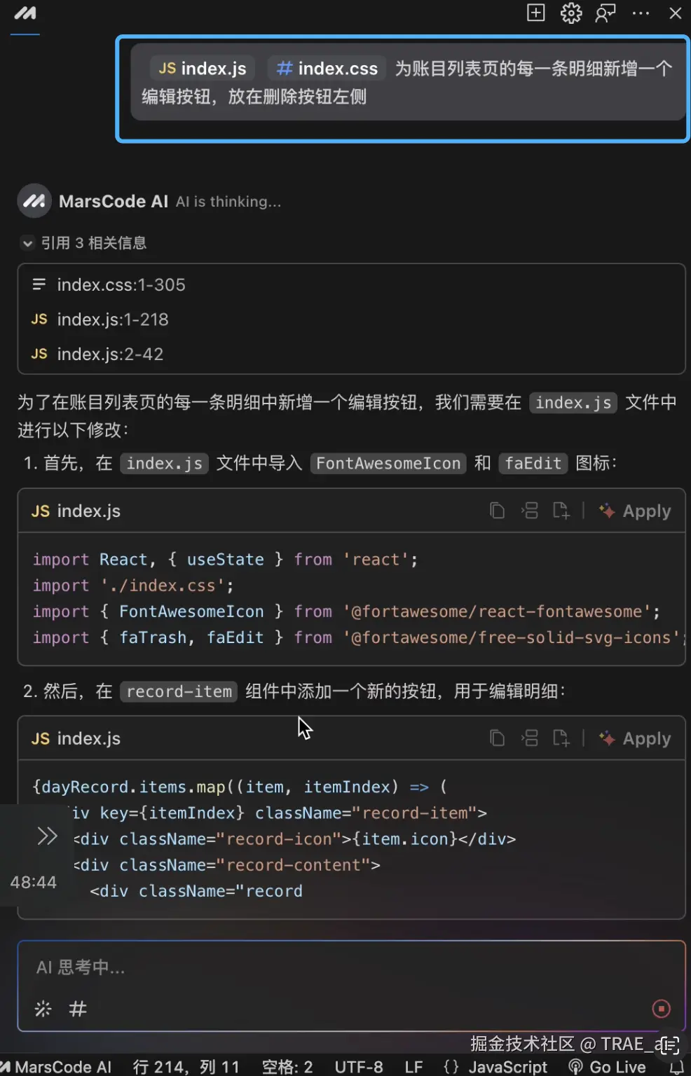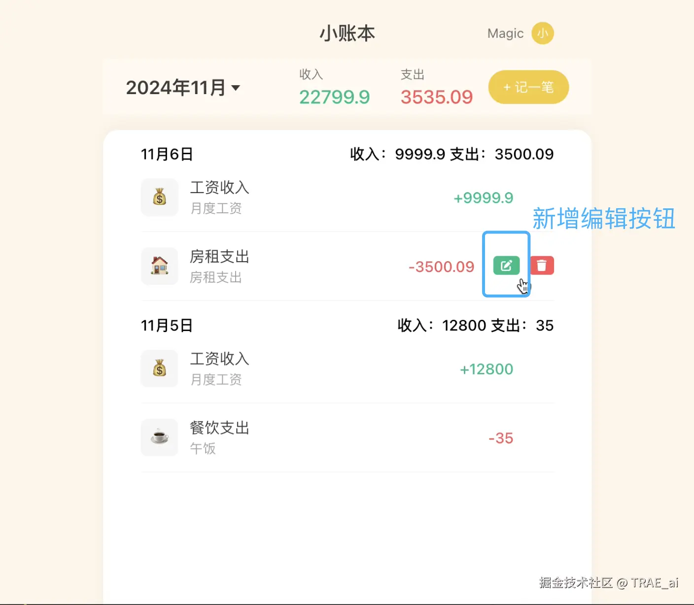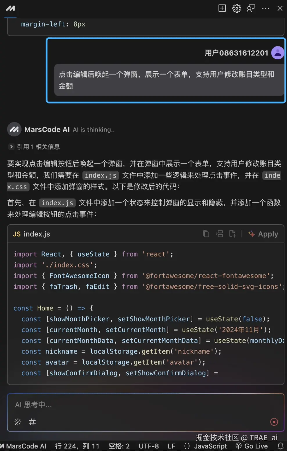 例如,在我的记账本项目中增加记账条目的“编辑”能力,并生成弹窗,支持修改账目类型和金额。豆包MarCode 先后找到了对应的页面文件,并生成了符合预期的代码,帮助我新增按钮、弹窗、然后完成了样式美化,最后实现了金额修改后,自动更新收支计算的数据。