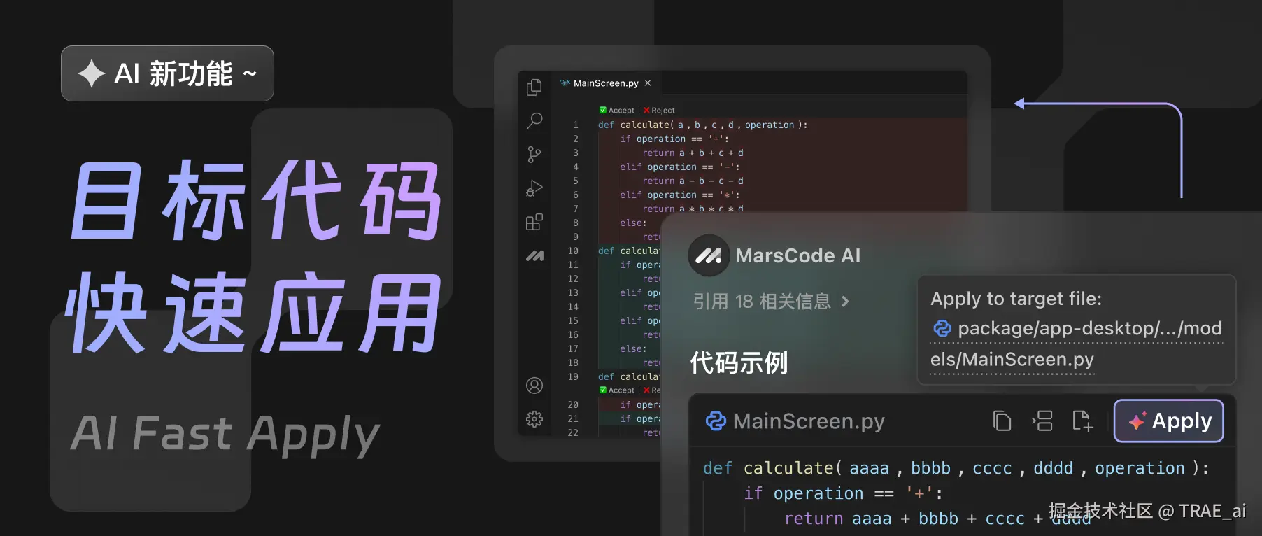 好消息!豆包MarsCode AI 问答上线新功能,一键 Apply AI 生成的代码片段至项目对应的文件位置并形成 Diff,无需手动打开文件、复制粘贴,AI 生成代码的体验更流畅,轻松化解这些困扰。