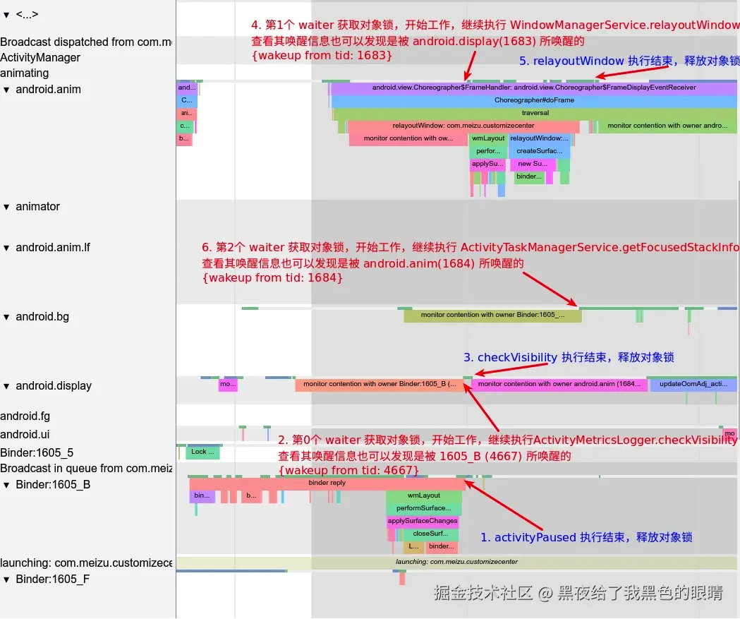 - android.anim 线程开始执行 「relayoutWindow」 方法,这个方法也是要获取 mGlobalLock 对象锁的,但是此时 Binder_1605_B 的 activityPaused 持有 mGlobalLock 对象锁 ,所以这里 android.display 的 checkVisibility 开始等待,进入 sleep 状态