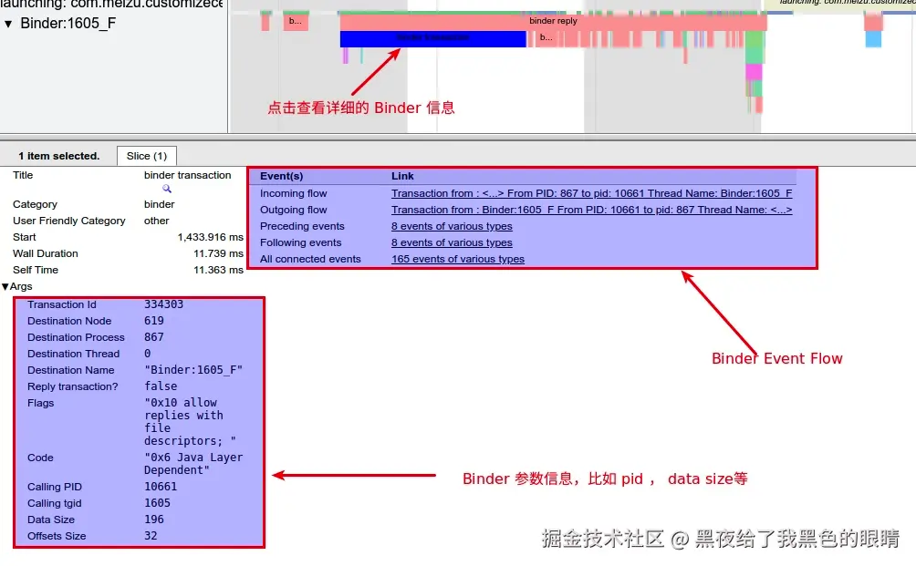 对于 Binder,这里主要介绍如何在 Systrace 中查看 Binder **「锁信息」和「锁等待」**这两个部分,很多卡顿和响应问题的分析,都离不开这两部分信息的解读,不过最后还是要回归代码,找到问题后,要读源码来理顺其代码逻辑,以方便做相应的优化工作