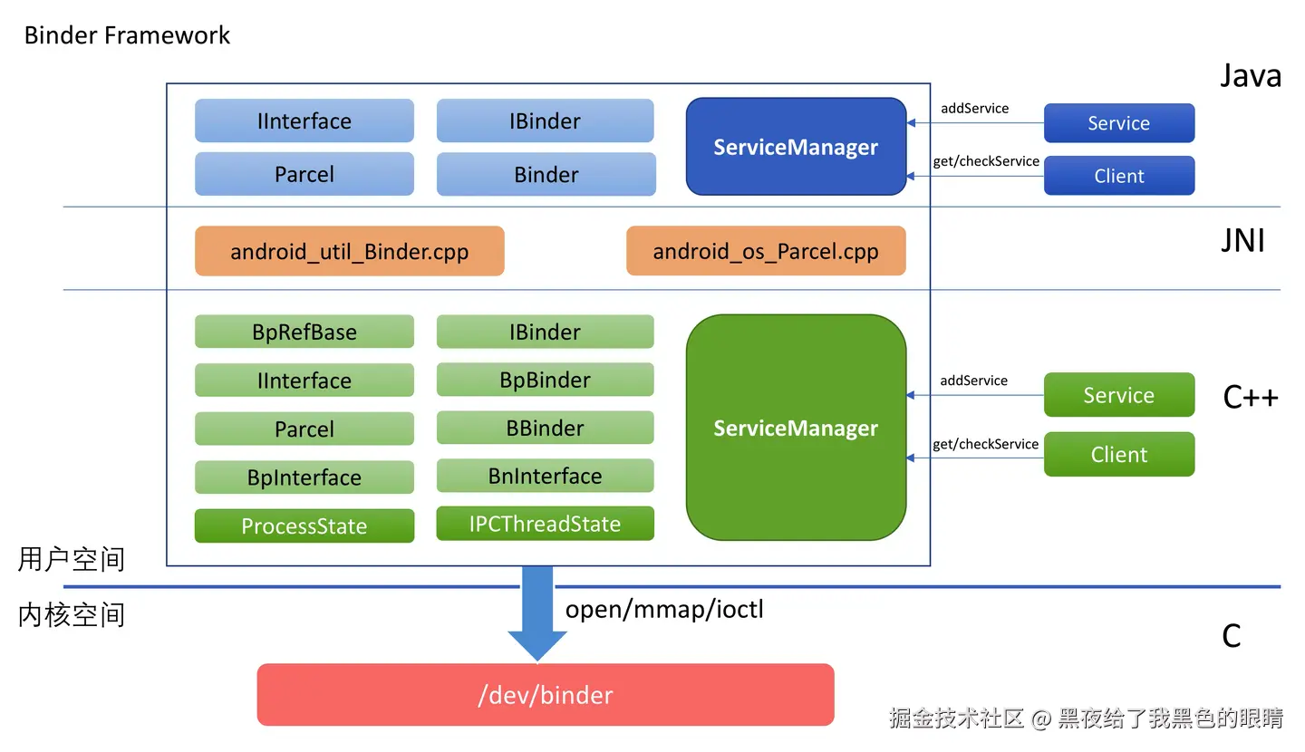 这里放一张文章里面的 Binder 架构图 , 本文主要是以 Systrace 为主,所以会讲 Systrace 中的 Binder 表现,不涉及 Binder 的实现