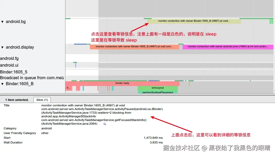 - android.display 线程开始执行 「checkVisibility」 方法,这个方法也是要获取 mGlobalLock 对象锁的,但是此时 Binder_1605_B 的 activityPaused 持有 mGlobalLock 对象锁 ,所以这里 android.display 的 checkVisibility 开始等待,进入 sleep 状态